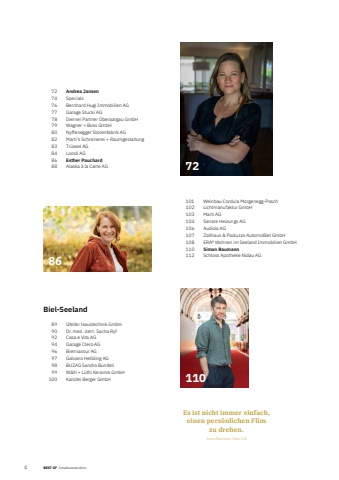 4 BEST OF Inhaltsverzeichnis72 Andrea Jansen74 Specials76 Bernhard Hugi Immobilien AG77 Garage Stucki AG78 Denner Partner Oberaargau GmbH79 Wagner + Boss GmbH80 Nyffenegger Storenfabrik AG82 Marti%u2019s Schreinerei + Raumgestaltung 83 Tr%u00fcssel AG84 Loosli AG86 Esther Pauchard88 Alaska %u00e0 la Carte AG101 Weinbau Cordula Morgenegg-Posch 102 Lichtmanufaktur GmbH103 Marti AG104 Sanare Heizungs AG106 Audizia AG107 Zollhaus & Paoluzzo AutomoBiel GmbH108 ERA%u00ae Wohnen im Seeland Immobilien GmbH110 Simon Baumann112 Schloss Apotheke Nidau AG7286110Biel-Seeland89 Gfeller Haustechnik GmbH90 Dr. med. dent. Sacha Ryf92 Casa e Vita AG94 Garage Clero AG96 Biennassur AG97 Galvano Helbling AG98 BUZAG Sandro Bundeli99 W%u00e4lti + L%u00fcthi Keramik GmbH100 Kanzlei Berger GmbHEs ist nicht immer einfach, einen pers%u00f6nlichen Flim zu drehen.Simon Baumann, Seite 110