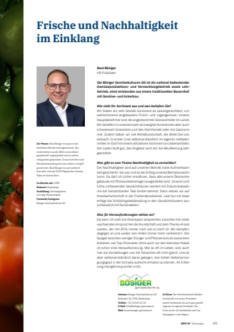 BEST OF BEST OF Oberaargau Interview 6520Adresse: B%u00f6siger Gem%u00fcsekulturen AGRotboden 10, 4704 NiederbippTelefon: +41 32 633 61 10E-Mail: info@boesiger-gemuese.chWeb: www.boesiger-gemuese.chIn K%u00fcrze: Der Familienbetrieb beliefert Kundschaft mit seinen Produkten sowohl landesweit als auch ganz gezielt regional im eigenen Dorfladen. Die Firma ist ein 1A-Lehrbetrieb und TopArbeitgeber in der Region.Beat B%u00f6sigerVR-Pr%u00e4sidentDie B%u00f6siger Gem%u00fcsekulturen AG ist ein national bedeutender Gem%u00fcseproduktions- und Vermarktungsbetrieb sowie Lehrbetrieb, einst entstanden aus einem traditionellen Bauernhof mit Gem%u00fcse- und Ackerbau. Wie sieht Ihr Sortiment aus und wen beliefern Sie?Wir bieten ein sehr breites Sortiment an saisongerechtem, umweltschonend angebautem Frisch- und Lagergem%u00fcse. Unsere Hauptabnehmer sind die angestammten Grossverteiler im Lande. Wir beliefern in unserem weit verzweigten Kundennetz aber auch schweizweit Grossisten und den Kleinhandel oder die Gastronomie. Zudem haben wir viel Abholkundschaft, die direkt bei uns einkauft. In erster Linie selbstverst%u00e4ndlich im eigenen Hofladen mitten im Dorf mit einem attraktiven Sortiment an Lebensmitteln. Der Laden l%u00e4uft gut, das Angebot wird von der Bev%u00f6lkerung sehr gesch%u00e4tzt.Was gibt es zum Thema Nachhaltigkeit zu vermelden?Der Nachhaltigkeit wird auf unserem Betrieb hohe Aufmerksamkeit geschenkt. Sie war und ist der Erfolg unseres Betriebswachstums. Da darf ich sicher erw%u00e4hnen, dass alle unsere %u00d6konomiegeb%u00e4ude mit Photovoltaikanlagen ausgestattet sind. Unsere rund 10 ha umfassenden Gew%u00e4chsh%u00e4user werden mit Industrieabw%u00e4rme der benachbarten Tela GmbH beheizt. Dann setzen wir auf Kreislaufwirtschaft in der Freilandproduktion. Last but not least erfolgt die Sch%u00e4dlingsbek%u00e4mpfung in den Gew%u00e4chsh%u00e4usern ausschliesslich mit Nutzinsekten. Was f%u00fcr Herausforderungen stehen an?Da kann ich wohl die Diskrepanz ansprechen zwischen den stets wachsenden Anspr%u00fcchen der Kundschaft und dem Thema %u00abFoodwaste%u00bb, der mit 30 % immer noch viel zu hoch ist. Wir k%u00e4mpfen dagegen an und wollen den Anteil immer mehr verkleinern. Der Spagat zwischen weniger D%u00fcnger und Pflanzenschutz sowie dem Anbieten von Top-Produkten ohne auch nur den kleinsten Makel ist schon eine Herausforderung. Wie so oft im Leben, sind auch hier die Vorstellungen und die Tatsachen oft nicht gleich. Uns ist aber selbstverst%u00e4ndlich daran gelegen, den hohen Selbstversorgungsgrad in der Schweiz aufrecht erhalten zu k%u00f6nnen. An Erfahrung mangelt es ja sicher nicht.Frische und Nachhaltigkeit im EinklangZur Person: Beat B%u00f6siger ist quasi in den elterlichen Betrieb hineingewachsen. Das Unternehmen wurde 2004 in eine Aktiengesellschaft umgewandelt und ist seither stetig weiter gewachsen. Grosse Schritte in der Betriebsentwicklung hat man seither in Angriff genommen. Beat B%u00f6siger ist auch politisch sehr aktiv und seit 2018 Mitglied des Grossen Rates im Kanton Bern. Im Betrieb seit: 1990Wohnort: NiederbippAusbildung: Gem%u00fcseg%u00e4rtner mit eidg. MeisterdiplomFacebook/Instagram: B%u00f6siger Gem%u00fcsekulturen AG