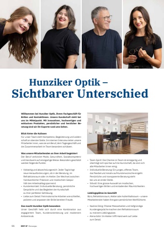6635 BEST OF BEST OF Oberaargau Portrait xxx Hunziker Optik %u2013Sichtbarer UnterschiedWillkommen bei Hunziker Optik, Ihrem Fachgesch%u00e4ft f%u00fcr Brillen und Kontaktlinsen. Unsere Kundschaft steht bei uns im Mittelpunkt. Mit innovativen, hochwertigen und exklusiven Produkten, pers%u00f6nlicher und herzlicher Beratung sind wir Ihr Experte rund ums Sehen.Blick hinter die Kulissen F%u00fcr unser Team steht Kompetenz, Begeisterung und Leidenschaft an oberster Stelle. Im internen Interview teilen unsere Mitarbeiter:nnen, was sie am Beruf, dem Tagesgesch%u00e4ft und der Zusammenarbeit im Team besonders sch%u00e4tzen. Was unsere Mitarbeitenden an ihrer Arbeit begeistertDer Beruf verbindet Mode, Gesundheit, Sozialkompetenz und Handwerk auf einzigartige Weise. Besonders gesch%u00e4tzt werden folgende Punkte:%u2022 Vielseitig und abwechslungsreich: Jeder Tag bringt neue Herausforderungen, ob in der Beratung, im Refraktionsraum oder im Atelier. Der Wechsel zwischen handwerklicher Pr%u00e4zision und modischem Gesp%u00fcr h%u00e4lt den Arbeitsalltag spannend.%u2022 Kundenkontakt: Individuelle Beratung, pers%u00f6nliche Gespr%u00e4che und das Begleiten der Kundschaft zu ihrer perfekten Sehl%u00f6sung.%u2022 Liebe zum Detail: Feinmotorische Arbeiten wie schleifen, polieren und anpassen der Brille bereiten Freude.Das macht Hunziker Optik besondersUnser Gesch%u00e4ft hebt sich durch eine Kombination aus en gagiertem Team, Kundenorientierung und modernem Ambiente ab.%u2022 Team-Spirit: Die Chemie im Team ist einzigartig und %u00fcbertr%u00e4gt sich sp%u00fcrbar auf die Kundschaft, da sind sich alle Mitarbeiter:innen einig.%u2022 Individuelle Beratung: Ein junges, offenes Team, das flexibel und kreativ auf Kundenw%u00fcnsche eingeht. Pers%u00f6nliche und transparente Beratung steht bei uns an erster Stelle.%u2022 Stilvoll: Eine grosse Auswahl an modischen, hochwertigen Brillen und einladenden R%u00e4umlichkeiten.Lieblingspl%u00e4tze im Gesch%u00e4ftB%u00fcro, Refraktionsraum, Atelier oder Aufenthaltsraum %u2013 unsere Mitarbeitenden haben ihre ganz pers%u00f6nlichen Wohlf%u00fchlorte.%u2022 Nadine D%u00f6rig: Pr%u00e4zise Messarbeiten und tiefgr%u00fcndige Kundengespr%u00e4che machen den Refraktionsraum zu meinem Lieblingsplatz.%u2022 Alena G%u00f6tz: Im Atelier trifft Handwerk auf Liebe zum Detail.