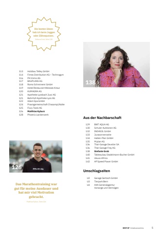 BEST OF Inhaltsverzeichnis 5113 Holzbau Telley GmbH114 Fimex Distribution AG %u2013 Technogym116 PK Immo AG117 BAUPLANS AG118 Romo Schreinerei GmbH119 Hotel Restaurant Weisses Kreuz120 KUMAGRA AG121 Apotheke Lyssbach Juwi AG121 Bahnhof-Apotheke Lyss AG122 Adam Spa GmbH124 Praxisgemeinschaft Chasampi/Nolte125 Flury Tools AG126 Matthias Kyburz128 Phoenix LackierwerkAus der Nachbarschaft129 BWT AQUA AG130 Schuler Auktionen AG132 INDASOL GmbH133 Jurasonnenseite134 Hallen-Plan GmbH135 Miplan AG136 Thal-Garage Develier SA136 Thal-Garage Frey AG138 Stefanie Grob140 Tableaubau Stadelmann-Bucher GmbH141 Ukuva iAfrica142 AP Speed Power GmbHUmschlagseitenU2 Garage Gerbsch GmbHU3 Tierpark BernU4 AXA Generalagentur Vorsorge und Verm%u00f6gen138Die besten Ideen hab ich beim Joggen oder Z%u00e4hneputzen.Stefanie Grob, Seite 138Das Marathontraining war gut f%u00fcr meine Ausdauer und hat mir viel Motivation gebracht. Matthias Kyburz, Seite 126126
