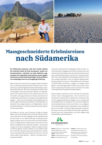 BEST OF BEST OF Oberaargau Portrait xxx 691Massgeschneiderte Erlebnisreisen nach S%u00fcdamerikaAdresse: Erlebnisreisen %u2013 Markus MathysSuedamerikaReisen.com GmbHRindermattweg 3, 4900 Langenthal Telefon: +41 62 922 24 24E-Mail: markus@suedamerikareisen.comWeb: www.suedamerikareisen.comIn K%u00fcrze: Ob einfach oder luxuri%u00f6s %u2013 als Spezialist f%u00fcr hochwertige, individuelle Erlebnisreisen organisieren wir eine S%u00fcdamerikareise, die hundertprozentig zu Ihnen passt: authentisch und einzigartig. Ein Weltwunder bestaunen, %u00fcber dem Urwald schlafen, die trockenste W%u00fcste der Erde durchqueren, abseits von Touristenstr%u00f6men, individuell auf jedes Bed%u00fcrfnis zugeschnitten: Ein Langenthaler Unternehmen machts m%u00f6glich. Kund:innen aus dem deutschsprachigen Raum profi tieren von erstklassigem Service und langj%u00e4hriger Erfahrung.%u00abBeim Anblick von Machu Picchu kriege ich jedes Mal G%u00e4nsehaut%u00bb, erz%u00e4hlt Reisespezialist Markus Mathys. Wer sich ihm anvertraut, erlebt die legend%u00e4re Ruinenstadt h%u00e4ufi g in einem besonderen Rahmen. Also nicht mit der grossen Masse. Daf%u00fcr im Nostalgie-Luxuszug mit feinsten Speisen und eigenem Guide. Eine weitere Variante: Man wandert %u00fcber den Inkatrail, zeltet unterwegs, erklimmt am Schluss verschwitzt und nudelfertig tausend Stufen und kriegt das Gl%u00fccksgef%u00fchl quasi doppelt %u2013 %u00abweil man sich den Blick auf das Weltwunder mit seinem eigenen Schweiss erk%u00e4mpft hat.%u00bb Diese Beispiele verdeutlichen das riesige Spektrum an M%u00f6glichkeiten, die die SuedamerikaReisen.com GmbH anbietet. Bei all dem gibt es eine Gemeinsamkeit.%u00abIch biete nur das an, was ich kenne%u00bb, bringt es Inhaber Mathys, der sich auf Erlebnisreisen nach Peru, Bolivien, Nordchile und Ecuador mit den Gal%u00e1pagos-Inseln spezialisiert hat, auf den Punkt. In der %u00abBeschr%u00e4nkung%u00bb auf wenige L%u00e4nder liegt die Qualit%u00e4t. Denn zum einen konnte sich Markus Mathys so eine unvergleichliche %u00abTiefensch%u00e4rfe%u00bb kombiniert mit einer ebenso unvergleichlichen Expertise aneignen: %u00abJedes Hotel und jede Tour, die wir empfehlen, haben wir selber auf Herz und Nieren gepr%u00fcft. Zudem arbeiten wir mit lokalen Anbietern zusammen, besitzen da ein grosses Netzwerk.%u00bb Zweiter Grund, weshalb die Beschr%u00e4nkung eine Chance ist, sind die L%u00e4nder selber. Diese besitzen %u2013 jedes f%u00fcr sich genommen %u2013 eine grosse Vielfalt.Etwa die ecuadorianischen Gal%u00e1pagos-Inseln mit ihrer unber%u00fchrten Natur, die gigantische Atacama-W%u00fcste Chiles, das bolivianische Hochplateau oder das s%u00fcdamerikanische Land, das so viele Facetten besitzt, wie sonst nur ein ganzer Kontinent: Peru. Das Land gilt als Surferparadies, besitzt mit Lima eine quirlige Grossstadt, in der es einige der global besten Restaurants gibt. Man kann von Meeresh%u00f6he zum Titicacasee auf 4500 Metern hochfahren, umgeben von eisigen Andengipfeln. Und einige Tage sp%u00e4ter schippert man auf dem Amazonas im exklusiven Flusshotel, links und rechts der Urwald, und entdeckt den Pacaya Samiria Nationalpark. Markus Mathys%u2019 Expertise hat sich weit %u00fcber die Schweizer Grenze hinaus herumgesprochen. Auch Kund:innen aus Deutschland und %u00d6sterreich schenken ihm ihr Vertrauen: Die von ihm organisierten Reisen spiegeln 1:1 die unterschiedlichen Bed%u00fcrfnisse. Er h%u00f6rt genau hin, macht Vorschl%u00e4ge und entwickelt gemeinsam mit den Kund:innen, ein unvergessliches mehrw%u00f6chiges Erlebnis. Dabei gibt er auch Empfehlungen ab. Eine davon: %u00abEntschleunigen, genug Zeit einplanen. Zum einen um sich an die H%u00f6henunterschiede zu gew%u00f6hnen. Die darf man nicht untersch%u00e4tzen. Und dann steigert langsames Reisen auch den Genuss.%u00bb