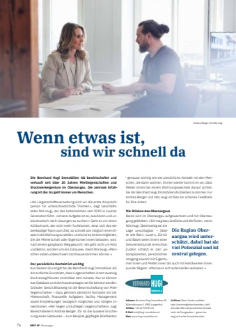 761 BEST OF BEST OF Oberaargau Portrait xxxWenn etwas ist, sind wir schnell daAdresse: Bernhard Hugi Immobilien AGBahnhofstrasse 4, 4900 LangenthalTelefon: +41 62 923 01 23E-Mail: info@hugi-immobilien.chWeb: www.hugi-immobilien.chIn K%u00fcrze: Wenn Ger%u00e4te ausfallen oder Unstimmigkeiten bestehen, z%u00e4hlt schnelle Hilfe und pers%u00f6nlicher Kontakt mehr als Paragraphen %u2013 genau hier zeigt sich echte Immobilienn%u00e4he.Die Bernhard Hugi Immobilien AG bewirtschaftet und verkauft seit %u00fcber 20 Jahren Mietliegenschaften und Stockwerkeigentum im Oberaargau. Die zentrale Erfahrung ist die: Es geht immer um Menschen.%u00abAls Liegenschaftsverwaltung sind wir die erste Ansprechperson f%u00fcr unterschiedlichste Themen%u00bb, sagt Gesch%u00e4ftsleiter Nils Hugi, der das Unternehmen seit 2019 in zweiter Generation f%u00fchrt. %u00abUnsere Aufgabe ist es, zuzuh%u00f6ren und unb%u00fcrokratisch nach L%u00f6sungen zu suchen.%u00bb Geht es um einen K%u00fchlschrank, der nicht mehr funktioniert, setzt sich das siebenk%u00f6pfi ge Team zum Ziel, so schnell wie m%u00f6glich einen Ersatz in die Wohnung zu stellen. Und sind es Unstimmigkeiten, die die Mieterschaft oder Eigent%u00fcmer:innen belasten, wird nach einem gangbaren Weg gesucht. %u00abEs geht nicht um Holz und Beton, sondern um ein Zuhause%u00bb, meint Nils Hugi, %u00abMenschen sollen unbeschwert nachhause kommen k%u00f6nnen.%u00bbDer pers%u00f6nliche Kontakt ist wichtigAus diesem Grund gilt bei der Bernhard Hugi Immobilien AG der einfache Grundsatz, dass Liegenschaften innert zwanzig bis dreissig Minuten erreichbar sein m%u00fcssen. Nur so k%u00f6nnen das Geb%u00e4ude und die Aussenanlagen seri%u00f6s betreut werden. Gr%u00f6sster Gesch%u00e4ftszweig ist die Bewirtschaftung von Mietliegenschaften %u2013 dazu geh%u00f6ren s%u00e4mtliche Kontakte mit der Mieterschaft, fi nanzielle Aufgaben, facility Management sowie Empfehlungen bez%u00fcglich m%u00f6glichen und n%u00f6tigen Investitionen. %u00abWir hegen und pflegen Liegenschaften%u00bb, sagt Bereichs leiterin Andrea Berger. Ihr ist die %u00e4ussere Erscheinung eines Geb%u00e4udes %u2013 zum Beispiel gepflegte Briefk%u00e4sten %u2013 genauso wichtig wie der pers%u00f6nliche Kontakt mit den Menschen, die darin wohnen. Immer wieder kommt es vor, dass Mieter:innen bei einem Wohnungswechsel darauf achten, bei der Bernhard Hugi Immobilien AG bleiben zu k%u00f6nnen. F%u00fcr Andrea Berger und Nils Hugi ist dies ein sch%u00f6nes Feedback f%u00fcr Ihre Arbeit.Die St%u00e4rken des OberaargausBeide sind im Oberaargau aufgewachsen und mit %u00dcberzeugung geblieben. %u00abIch mag das L%u00e4ndliche und die Ruhe%u00bb, meint Nils Hugi. Gleichzeitig sei die Lage unschlagbar %u2013 St%u00e4dte wie Bern, Luzern, Z%u00fcrich und Basel seien innert einer Dreivier telstunde erreichbar. Zudem sch%u00e4tzt er den unkomplizierten, pers%u00f6nlichen Umgang sowohl mit Eigent%u00fcmer:innen und Mieter:innen als auch mit Handwerker:innen aus der Region: %u00abMan kann sich aufeinander verlassen.%u00bbDie Region Oberaargau wird untersch%u00e4tzt, dabei hat sie viel Potenzial und ist zentral gelegen. Andrea Berger und Nils Hugi