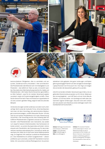 BEST OF BEST OF Oberaargau Portrait xxx 8148Adresse: Nyffenegger Storenfabrik AGIndustriestrasse 3, 4950 HuttwilTelefon: +41 62 959 84 84E-Mail: info@nyffenegger.chWeb: www.nyffenegger.chIn K%u00fcrze: Mit innovativen Produkten und Serviceleistungen im Sonnen- und Wetterschutz bringen wir das Zusammenspiel von Licht, Schatten und W%u00e4rme in Harmonie. Unsere Systeme sch%u00fctzen vor %u00dcberhitzung, geben ein Gef%u00fchl von Geborgenheit und steigern Ihre Lebensqualit%u00e4t zu Hause oder am Arbeitsplatz.kommunikativen F%u00e4higkeiten, dies zu vermitteln und versuchen, Sonderw%u00fcnsche um zusetzen.%u00bb Hier wird deutlich: Die Mitarbeitenden identifi zieren sich mit Arbeitgeberin und Produkten %u2013 das Gef%u00fchl ein Team zu sein, ist deutlich sp%u00fcrbar. Dies dank einer Wechselwirkung zwischen GL, Kader und Mitarbeitenden: %u00abWir haben flache Hierarchien geschaffen%u00bb, so Albin Sarbach, %u00abwas f%u00fcr ein starkes Verantwortungsbewusstsein sorgt und Zusammengeh%u00f6rigkeit schafft.%u00bb Dass flache Hierarchien beim Team nicht bloss ein Lippenbekenntnis sind, sondern gelebter Alltag, zeigt ein beein druckendes Beispiel. Umstrukturierungen werden anderswo von oben nach unten verf%u00fcgt. Nicht so bei der Huttwiler Firma: %u00abEine Sachbearbeiterin kam mit dem Vorschlag, drei administrative Abteilungen zusammenzulegen%u00bb, erz%u00e4hlt Alexander Muster. %u00abPrim%u00e4r, weil sie und andere Mitarbeitende sich mehr Abwechslung w%u00fcnschten.%u00bb Der Vorschlag wurde unter Einbezug aller betroffenen Mitarbeitenden umgesetzt und zwar aus mehreren Gr%u00fcnden: %u00abDie Mitarbeitenden sind motivierter, das wiederum sorgt f%u00fcr bessere Arbeitsresultate. Das Fachwissen ist breiter verteilt %u2013 so wird ein Klumpenrisiko verhindert. Und es erlaubt mehr Flexibilit%u00e4t in der Ferienplanung. F%u00fcr das Unternehmen machte es also absolut Sinn. Und weil wir weiter am wachsen sind, fallen durch die Fusion keine Stellenprozente weg. Im Gegenteil: Wir stell(t)en zus%u00e4tzliche Mitarbeitende an.%u00bb Das Arbeitsklima ist wirklich ausgezeichnet %u2013 %u00abdavon profi tieren auch Lernende%u00bb, erkl%u00e4rt HR-Teamleiterin Carmen Vetter. %u00abF%u00fcr sie wird ein sch%u00f6nes P%u00e4ckli geschn%u00fcrt. So wird ein attraktiver Lohn geboten, bei guten Leistungen und Noten gibt es grossz%u00fcgige Pr%u00e4mien und den zwingend notwendigen Laptop fi nanziert die Firma auch mit.%u00bb Von Tag 1 an kriegen die Lernenden die Gewissheit, gebraucht zu werden.%u00abDie KV-Lernenden erhalten Verantwortung im B%u00fcro, die angehenden Storenmonteure packen vor Ort mit an. Dabei werden sie eng begleitet %u2013 vom HR Team und von ihrem Berufsbildner%u00bb, so Carmen Vetter. %u00abIm Vordergrund steht aber das Sammeln eigener Erfahrungen. Darunter eine sehr sch%u00f6ne, die man jeweils nach Abschluss eines Auftrages macht: Die Dankbarkeit der Kundschaft.%u00bb