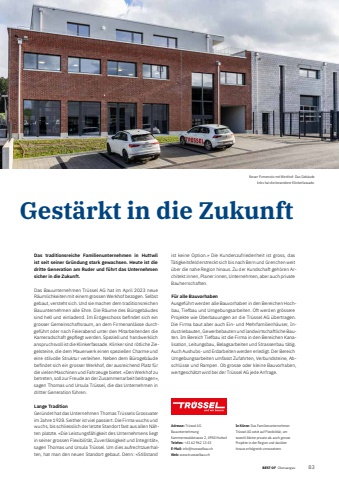 BEST OF BEST OF Oberaargau Portrait xxx 8361Gest%u00e4rkt in die ZukunftAdresse: Tr%u00fcssel AG BauunternehmungKammernwaldstrasse 2, 4950 HuttwilTelefon: +41 62 962 13 43E-Mail: info@truesselbau.chWeb: www.truesselbau.chIn K%u00fcrze: Das Familienunternehmen Tr%u00fcssel AG setzt auf Flexibilit%u00e4t, um sowohl kleine private als auch grosse Projekte in der Region und dar%u00fcber hinaus erfolgreich umzusetzen.Das traditionsreiche Familienunternehmen in Huttwil ist seit seiner Gr%u00fcndung stark gewachsen. Heute ist die dritte Generation am Ruder und f%u00fchrt das Unternehmen sicher in die Zukunft.Das Bauunternehmen Tr%u00fcssel AG hat im April 2023 neue R%u00e4umlichkeiten mit einem grossen Werkhof bezogen. Selbst gebaut, versteht sich. Und sie machen dem traditionsreichen Bauunternehmen alle Ehre. Die R%u00e4ume des B%u00fcrogeb%u00e4udes sind hell und einladend. Im Erdgeschoss befi ndet sich ein grosser Gemeinschaftsraum, an dem Firmenanl%u00e4sse durchgef%u00fchrt oder nach Feierabend unter den Mitarbeitenden die Kameradschaft gepflegt werden. Speziell und handwerklich anspruchsvoll ist die Klinkerfassade. Klinker sind r%u00f6tliche Ziegelsteine, die dem Mauerwerk einen speziellen Charme und eine stilvolle Struktur verleihen. Neben dem B%u00fcrogeb%u00e4ude befi ndet sich ein grosser Werkhof, der ausreichend Platz f%u00fcr die vielen Maschinen und Fahrzeuge bietet. %u00abDen Werkhof zu betreten, soll zur Freude an der Zusammenarbeit beitragen%u00bb, sagen Thomas und Ursula Tr%u00fcssel, die das Unternehmen in dritter Generation f%u00fchren.Lange TraditionGer%u00fcndet hat das Unternehmen Thomas Tr%u00fcssels Grossvater im Jahre 1928. Seither ist viel passiert. Die Firma wuchs und wuchs, bis schliesslich der letzte Standort fast aus allen N%u00e4hten platzte. %u00abDie Leistungsf%u00e4higkeit des Unternehmens liegt in seiner grossen Flexibilit%u00e4t, Zuverl%u00e4ssigkeit und Integrit%u00e4t%u00bb, sagen Thomas und Ursula Tr%u00fcssel. Um dies aufrechtzuerhalten, hat man den neuen Standort gebaut. Denn: %u00abStillstand ist keine Option.%u00bb Die Kundenzufriedenheit ist gross, das T%u00e4tigkeitsfeld erstreckt sich bis nach Bern und Grenchen weit %u00fcber die nahe Region hinaus. Zu der Kundschaft geh%u00f6ren Architekt:innen, Planer:innen, Unternehmen, aber auch private Bauherrschaften.F%u00fcr alle BauvorhabenAusgef%u00fchrt werden alle Bauvorhaben in den Bereichen Hochbau, Tiefbau und Umgebungsarbeiten. Oft werden gr%u00f6ssere Projekte wie %u00dcberbauungen an die Tr%u00fcssel AG %u00fcbertragen. Die Firma baut aber auch Ein- und Mehrfamilienh%u00e4user, Industriebauten, Gewerbebauten und landwirtschaftliche Bauten. Im Bereich Tiefbau ist die Firma in den Bereichen Kanalisation, Leitungsbau, Belagsarbeiten und Strassenbau t%u00e4tig. Auch Aushubs- und Erdarbeiten werden erledigt. Der Bereich Umgebungsarbeiten umfasst Zufahrten, Verbundsteine, Abschl%u00fcsse und Rampen. Ob grosse oder kleine Bauvorhaben, wertgesch%u00e4tzt wird bei der Tr%u00fcssel AG jede Anfrage.Neuer Firmensitz mit Werkhof: Das Geb%u00e4ude links hat die besondere Klinkerfassade.