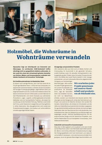 841 BEST OF BEST OF Oberaargau Portrait xxxHolzm%u00f6bel, die Wohnr%u00e4ume in Wohntr%u00e4ume verwandelnWyssachen liegt am Schnittpunkt von Emmental und Oberaargau. Im vertr%u00e4umten 1100-Seelendorf treffen aller dings nicht nur geografi sche Gebiete aufeinander. In der Loosli AG, einem der schweizweit gr%u00f6ssten Hersteller von K%u00fcchen, B%u00e4dern und Innenausbauten verbindet sich lokales Handwerk mit innovativer Technologie. Ein Familienunternehmen im klassischen SinneEs dauert noch wenige Monate, dann darf die Loosli AG ihr 70-j%u00e4hriges Bestehen feiern. %u00ab1956 hat mein Grossvater, ein diplomierter Schreinermeister, in diesem Tal den Grundstein der heutigen Firmengruppe gelegt%u00bb, sagt Matthias Loosli und zeigt bachabw%u00e4rts zum Ort, wo das erste Geb%u00e4ude stand. Die kleine Schreinerei hat sich mittlerweile zu einem Betrieb mit 160 Mitarbeitenden und einem Komplex aus zahlreichen Produktions-, Lager-, Logistik- und B%u00fcrogeb%u00e4uden entwickelt. Geblieben sind die handwerkliche Tradition, die lokale Verwurzelung und die famili%u00e4re F%u00fchrung. Matthias Loosli leitet die Firma, zu der Standorte in Langenthal und Cham geh%u00f6ren, in dritter Generation. Neu dazugekommen sind modernste Produktionstechnologien, die kreative und wirtschaftliche Umsetzungsm%u00f6glichkeiten bieten.Einzigartige und pers%u00f6nliche Produkte%u00abWir realisieren alles aus Holz rund um B%u00e4der, K%u00fcchen und Innenausbau f%u00fcr Kundschaft in der gesamten Schweiz%u00bb, erz%u00e4hlt Matthias Loosli. Ein aktueller Auftrag besteht in der Ausgestaltung aller Filialen eines Schweizer Grossunternehmens. Die St%u00e4rke des Loosli-Teams besteht in der massgeschneiderten und auf individuelle W%u00fcnsche abgestimmten Fertigung von hochwertigen Wohnl%u00f6sungen. %u00abWir erarbeiten jedes Projekt gemeinsam mit unserer Kundschaft und produzieren ab St%u00fcckzahl eins%u00bb, sagt der Gesch%u00e4ftsleiter. So entstehen K%u00fcchen, die nicht nur Bed%u00fcrfnisse erf%u00fcllen, sondern zum Herzst%u00fcck des Hauses werden. Wer L%u00f6sungen von der Stange sucht, ist bei den Fachm%u00e4nnern und -Frauen von Loosli an der falschen Adresse. Hier werden Materialien, Kantenfarben, die Gr%u00f6sse der Schubladen und die H%u00f6he der Arbeitsfl%u00e4che auf pers%u00f6nliche Vorlieben angepasst. F%u00fcr ganzheitliche Wohnerlebnisse k%u00f6nnen die hochwertigen Materialien %u00fcber den Raumtrenner bis in die Garderobe, vom Ankleidezimmer %u00fcber die Sitzbank bis zum B%u00fccherregal weitergezogen werden. H%u00f6chste Qualit%u00e4tsanspr%u00fcche und ein ansprechendes Design sind bei s%u00e4mtlichen Projekten, vom kleinen Badem%u00f6bel bis zum kompletten Innenausbau, eine Selbstverst%u00e4ndlichkeit.Industriell und manuell im ZusammenspielWas oben im B%u00fcro geplant und visualisiert wird, kann direkt auf die Maschinen unten in der Werkhalle %u00fcbermittelt werden. Ein Blick in die lichtdurchfluteten Produktionsr%u00e4ume zeigt: Die Fertigungsabl%u00e4ufe sind hoch technisiert und dadurch wirtschaftlich interessant. %u00abUns zeichnet eine schnelle Fertigung aus, da wir ein grosses Warenlager bewirtschaften und Wir erarbeiten jedes Projekt gemeinsam mit unserer Kundschaft und produzieren ab St%u00fcckzahl eins.