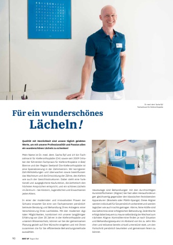 9025 BEST OF BEST OF Region Biel Portrait xxxF%u00fcr ein wundersch%u00f6nes L%u00e4cheln Dr. med. dent. Sacha RyfFachzahnarzt f%u00fcr Kieferorthop%u00e4dieQualit%u00e4t mit Herzlichkeit sind unsere t%u00e4glich gelebten Werte, um mit unserer Professionalit%u00e4t und Passion allen ein wundersch%u00f6nes L%u00e4cheln zu schenken! Mein Name ist Dr. med. dent. Sacha Ryf und ich bin Fachzahnarzt f%u00fcr Kieferorthop%u00e4die (CH) sowie seit 2009 Inhaber der f%u00fchrenden Fachpraxis f%u00fcr Kieferorthop%u00e4die in Biel/Bienne und der Region Seeland! Die Kieferorthop%u00e4die ist eine Spezialisierung in der Zahnmedizin. Wir korrigieren Zahnfehlstellungen und %u00fcberwachen sowie beeinflussen das Wachstum und die Entwicklung der Z%u00e4hne, des Kiefers wie auch der Gesichtsstrukturen. Dabei steht eine funktionell und ausgeglichene Kaufunktion, die %u00e4sthetisch den h%u00f6chsten Anspr%u00fcchen entspricht, und ein sch%u00f6nes L%u00e4cheln im Zentrum %u2013 bei Kindern, Jugendlichen und Erwachsenen jeden Alters.In einer der modernsten und innovativsten Praxen der Schweiz erwartet Sie eine von Fachpersonen pers%u00f6nlich betreute Beratung und Behandlung Ihres Anliegens einer Versch%u00f6nerung Ihres Lachbildes. Mit den modernen digitalen M%u00f6glichkeiten, kombiniert mit unserer langj%u00e4hrigen Erfahrung von %u00fcber 20 Jahren in der Kieferorthop%u00e4die und unserem Wissensschatz, k%u00f6nnen wir bei der gemeinsamen Planung gezielt auf Ihre W%u00fcnsche eingehen und mit Ihnen zusammen die f%u00fcr Sie effi zienteste Behandlungsmethode ausw%u00e4hlen.Heutzutage sind Behandlungen mit den durchsichtigen Kunststoffschienen (Aligner) bei fast allen Herausforderungen gleichwertig gegen%u00fcber den klassischen festsitzenden Apparaturen (Brackets oder Pl%u00e4ttli-Spange). Diese Aligner werden individuell f%u00fcr Sie pers%u00f6nlich vorbereitet und werden tags%u00fcber wie auch nachts getragen. Kleine, feine Kr%u00e4fte sind das Geheimnis einer erfolgreichen Behandlung. Jede Woche erfolgt dabei bequem zu Hause selbst%u00e4ndig der Wechsel zum n%u00e4chsten Aligner. Kontrolltermine fi nden je nach Situation und Behandlungssequenz im Abstand von bis zu zehn Wochen und teilweise bereits virtuell unterst%u00fctzt statt, um den Fortschritt pers%u00f6nlich beurteilen und gemeinsam feiern zu k%u00f6nnen.