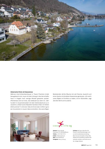BEST OF BEST OF Portrait xxx Region Biel 932Adresse: Casa e Vita AGPoststrasse 19, 2504 Biel/BienneTelefon: +41 32 344 74 74E-Mail: info@casaevita.chWeb: www.casaevita.chInstagram: casa_e_vita_agIn K%u00fcrze: Die Casa e Vita AG ist Ihr Partner f%u00fcr alle Dienstleistungen rund um die Immobilienbewirtschaftung. Wenn Sie eine Immobilie im Raum Biel, Seeland und Juras%u00fcdfuss erwerben oder verkaufen m%u00f6chten, sind Sie bei uns an der richtigen Adresse.Historische Perle mit SeeanstossW%u00e4hrend die Einfamilienh%u00e4user in Twann-T%u00fcscherz direkt bezugsbereit sind, muss mit dem Umzug in das Herrschaftshaus in Vingelz noch wenige Monate gewartet werden. %u00abMomentan sind wir dran, das Geb%u00e4ude aus dem 15. Jahrhundert in Zusammenarbeit mit dem Denkmalschutz zu renovieren%u00bb, erkl%u00e4rt Junior Bauleiter Giordano Vitali. Im Herbst 2025 wird die 7.5-Zimmer-Villa mit ihrem %u00fcber 1198%u00a0m2 grossen Grundst%u00fcck in neuem Glanz erstrahlen. Die zuk%u00fcnftigen Besitzenden d%u00fcrfen R%u00e4ume mit viel Charme, Aussicht und einen Garten mit direktem Seeanstoss geniessen. %u00abEin solch rares Objekt im Portfolio zu haben, ist ein Gl%u00fccksfall%u00bb, sagt Jennifer Wirth schmunzelnd.