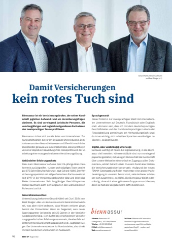 961 BEST OF BEST OF Region Biel Portrait xxx Damit Versicherungen kein rotes Tuch sindAdresse: Biennassur AGSilbergasse 6, 2502 Biel/BienneTelefon: +41 32 328 20 60E-Mail: info@biennassur.ch Web: www.biennassur.chIn K%u00fcrze: Effi zienz trifft Innovation: Biennassur digitalisiert Versicherungsprozesse, spart Zeit und bietet papierlosen Zugriff %u2013 modern und umweltfreundlich.G%u00e9rard H%u00e4feli, Stefan Kaufmann und Beat R%u00fceger (v. l.)Biennassur ist ein Versicherungsbroker, der seiner Kundschaft jeglichen Aufwand rund um Versicherungsfragen abnimmt. Es sind vorwiegend juristische Per sonen, die vom langj%u00e4hrigen und zugleich zeitgem%u00e4ssen Fachwissen des zweisprachigen Teams profi tieren.Biennassur richtet sich an alle Arten von Unternehmen. Zur Kundschaft z%u00e4hlen die vor Ort ans%u00e4ssige Uhrenindustrie, Institutionen aus dem Gesundheitswesen und %u00f6ffentlich-rechtliche Dienstleister genauso wie Gewerbebetriebe. Diese profi tieren von einer objektiven Bewertung ihres Risiko profi ls und der Erarbeitung einer massgeschneiderten Versicherungsl%u00f6sung. Geb%u00fcndelter ErfahrungsschatzDazu kann Biennassur auf eine bald 25-j%u00e4hrige Branchenkenntnis zur%u00fcckgreifen. %u00abUnser sechsk%u00f6pfi ges Team vereint gut 170 Jahre Berufserfahrung%u00bb, sagt G%u00e9rard H%u00e4feli. Der Versicherungsspezialist mit eidgen%u00f6ssischem Fachausweis ist seit 1997 in der Versicherungsbranche t%u00e4tig und leitet das Bieler Unternehmen. Sein langj%u00e4hriger Gesch%u00e4ftspartner Stefan Kaufmann zieht sich langsam in den wohlverdienten Ruhestand zur%u00fcck. GenerationenwechselUnterst%u00fctzung bekommt G%u00e9rard H%u00e4feli seit Juni 2024 von Beat R%u00fceger. %u00abBei uns kam es zu einem Generationenwechsel, was aber nicht bedeutet, dass Wissen verloren ging%u00bb, betont der Firmenleiter. Ganz im Gegenteil, sein neuer Sparringpartner ist bereits seit 23 Jahren in der Versicherungsbranche t%u00e4tig. %u00abIch durfte bei verschiedenen Versicherungsgesellschaften Erfahrungen sammeln, die ebenfalls auf Unternehmenskundschaft spezialisiert sind%u00bb, sagt Beat R%u00fceger. Der Unternehmensberater ist Mandatsleiter, also direkt mit den Kundinnen und Kunden im Austausch.SprachgewandtDieser fi ndet in der zweisprachigen Stadt mit internationalen Unternehmen auf Deutsch, Franz%u00f6sisch oder Englisch statt. %u00abEs kann sein, dass ich mit dem deutschsprachigen Gesch%u00e4ftsleiter und der franz%u00f6sischsprachigen Leiterin der Finanzabteilung gemeinsam am Verhandlungstisch sitze, da ist es wichtig, sich in beiden Sprachen verst%u00e4ndigen zu k%u00f6nnen%u00bb, so Beat R%u00fceger. Digital, aber unabh%u00e4ngig unterwegsGenauso wichtig ist heute die Digitalisierung, in die Biennassur viel investiert. %u00abUnsere Abl%u00e4ufe sind nun vorwiegend papierlos gestaltet, mit wenigen Klicks erh%u00e4lt die Kundschaft %u00fcber unsere Webseite elektronischen Zugang zu allen Dokumenten%u00bb, erkl%u00e4rt G%u00e9rard H%u00e4feli. In einem Punkt aber bleiben die Versicherungsbroker konservativ. %u00abAufgrund der neuen FINMA-Gesetzgebung fi ndet momentan eine grosse Marktbereinigung in unserem Sektor statt, viele Anbieter schliessen sich zusammen%u00bb, so H%u00e4feli. Die Biennassur bleibt eigenst%u00e4ndig, ohne sich einer gr%u00f6sseren Gruppe anzuschliessen, denn sie h%u00e4lt alle Vorgaben der FINMA bestens ein.