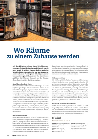 981 BEST OF BEST OF Portrait xxx Surselva %u2013 Flims %u2013 Laax Wo R%u00e4umezu einem Zuhause werdenAdresse: Wehrli Innenausstattungen AGSTENNA Flims, Via Nova 80, 7017 Flims DorfTelefon: +41 81 911 19 30E-Mail: wehrli-raum@flims.chWeb: www.wehrli-raum.chIn K%u00fcrze: Hier entsteht aus jeder Zusammenarbeit etwas Einzigartiges %u2013 und am Ende mehr als nur ein sch%u00f6n eingerichteter Raum: ein Ort mit Seele.Seit %u00fcber 25 Jahren steht der Name Wehrli Innenausstattungen f%u00fcr Qualit%u00e4t, Handschlag-Ehrlichkeit und ein gutes Gesp%u00fcr f%u00fcr sch%u00f6nes Wohnen. Gef%u00fchrt von Stefan Wehrli in f%u00fcnfter Generation, ist aus dem kleinen Gesch%u00e4ft vis %u00e0 vis der Post l%u00e4ngst ein vielseitiger, moderner Innenausstattungsbetrieb geworden. Und doch ist eines geblieben: Die Liebe zum Handwerk und das Ziel, aus einem Raum ein echtes %u00abDahai%u00bb zu machen.Neue R%u00e4ume, bew%u00e4hrte WerteIm Sommer 2023 hat Wehrli Innenausstattungen ein neues Kapitel aufgeschlagen. Der traditionsreiche Betrieb ist ins STENNA Flims gezogen, in gr%u00f6ssere, helle R%u00e4umlichkeiten mit viel Platz f%u00fcr Ideen. Was fr%u00fcher im kleinen Holzl%u00e4deli auf wenigen Quadratmetern gen%u00e4ht, gepolstert und beraten wurde, fi ndet heute auf 95 m2 Raum zur Entfaltung. Hier k%u00f6nnen Kundinnen und Kunden mit eigenen Augen sehen, f%u00fchlen und erleben, wie sich ein Wohntraum verwirklichen l%u00e4sst. Im neuen Showroom wird nicht inszeniert, sondern inspiriert. Neben einer grossen Auswahl an Bodenbel%u00e4gen und Vorhangstoffen gibt es ausgesuchte M%u00f6bel, Leuchten, Kissen, Decken, Wohnaccessoires, und immer wieder liebevolle, kleine Hingucker, die zeigen, worum es bei Wehrli geht: Atmosph%u00e4re. W%u00e4rme. Pers%u00f6nlichkeit.Holz als HerzenssacheStefan Wehrli kennt Holz wie kaum ein anderer. Ob Dielenboden, Wandverkleidung oder Massanfertigung %u2013 seine Projekte sind gepr%u00e4gt von echtem Materialwissen, Pr%u00e4zision und einem feinen Sinn f%u00fcr %u00c4sthetik. Besonders gern arbeitet er mit heimischen H%u00f6lzern wie Eiche oder Nussbaum, deren Struktur, Farbspiel und Charakter den R%u00e4umen ein lebendiges, nat%u00fcrliches Gef%u00fchl geben. %u00abHolz lebt, man muss es verstehen, dann entfaltet es seine ganze Kraft im Raum%u00bb, sagt er.Das zeigt sich auch in anspruchsvollen Projekten. Etwa in einem Sichtbeton-Neubau, bei dem das massive Eichenpaneel einen warmen Kontrast zur k%u00fchlen Architektur geschaffen hat. Solche Kombinationen aus Tradition und Moderne ziehen sich wie ein roter Faden durch seine Arbeit.Wohnideen mit HerzMit viel Feingef%u00fchl f%u00fcr Farben, Texturen und Stimmungen wird die Kundschaft in der Ausstellung oder direkt bei sich zu Hause zu den gestalterischen M%u00f6glichkeiten beraten. Die Handschrift des Wehrli Teams ist gem%u00fctlich, zeitlos, liebevoll. Ob stilvoll gedeckter Tisch, kuschelige Sofa-Ecke oder fein abgestimmte Vorh%u00e4nge, hier werden Wohlf%u00fchlorte geschaffen, die sich nicht an Trends, sondern an Menschen orientieren. Wer das Gesch%u00e4ft betritt, sp%u00fcrt sofort: Hier geht es darum, das Zuhause als R%u00fcckzugsort zu gestalten. Als Ort zum Durchatmen, Ankommen, Loslassen. Als Ort, wo man gern ist und gern bleibt. Ein echtes Dahai eben.Pers%u00f6nlich. Verl%u00e4sslich. Echte Flimser.Wehrli Innenausstattungen steht heute nicht nur f%u00fcr Erfahrung und Qualit%u00e4t, sondern auch f%u00fcr N%u00e4he. F%u00fcr ein offenes Ohr, ehrliche Beratung und L%u00f6sungen, die wirklich passen. Ob kleine Ver%u00e4nderung oder grosses Umbauprojekt %u2013 das Team begleitet individuell, unkompliziert und mit Herzblut.