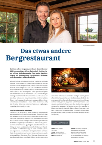 BEST OF Surselva %u2013 Flims %u2013 Laax BEST OF Portrait xxx 991 Das etwas andere BergrestaurantAdresse: Ustria Startgels7017 FlimsTelefon: +41 81 911 58 48E-Mail: restaurant@startgels.chWeb: www.startgels.chIn K%u00fcrze: Ob Grilladen, authentische B%u00fcndnergerichte oder exklusive Gourmet-Men%u00fcs mit edlen Tropfen %u2013 in der Ustria Startgels inmitten des Ski- und Wandergebiets von Flims-Laax kommen alle auf ihre Kosten.Es ist ein wahres Bergrestaurant-Juwel. Die seit Sommer 2022 vom geb%u00fcrtigen Wiener Spitzenkoch Christian Kaiser gef%u00fchrte Ustria Startgels bei Flims vereint Alph%u00fcttenCharme mit Gourmetk%u00fcche. Eine Mischung, die immer mehr Stammg%u00e4ste auf den Berg lockt.Ein kulinarischer und gesellschaftlicher Treffpunkt f%u00fcr Einheimische, Tourist:innen und Tagesg%u00e4ste inmitten der wundersch%u00f6nen Flimser Berglandschaft. Genau das ist das Bergrestaurant Ustria Startgels bei Flims auf 1600 Metern %u00fcber Meer. Erg%u00e4nzt werden muss diese Aufz%u00e4hlung mittlerweile noch mit dem Ausdruck %u00abf%u00fcr Stammg%u00e4ste%u00bb. Denn gem%u00e4ss Gastgeber Christian Kaiser sind es unterdessen rund 60 Prozent regelm%u00e4ssig wiederkehrende Besucherinnen und Besucher, die den Weg %u2013 entweder zu Fuss, mit dem Bike, im Winter auf den Skiern und Snowboards, oder dann ganz gem%u00fctlich mit der %u00abFlemXpress%u00bb Umlaufbahn %u2013 in die Ustria fi nden. Eine Zahl, die Christian Kaiser nur mit einem fast schon ungl%u00e4ubigen %u00abgewaltig%u00bb kommentieren mag.Viele Gr%u00fcnde f%u00fcr eine WiederkehrTats%u00e4chlich ist eine derart hohe Anzahl an Stammg%u00e4sten aussergew%u00f6hnlich f%u00fcr ein Bergrestaurant. Obwohl, ein klassisches Bergrestaurant ist die Ustria Startgels ohnehin nicht. Sie ist viel mehr als das. Gem%u00e4ss dem Gourmetf%u00fchrer %u00abGault Millau%u00bb etwa %u2013 wo das Startgels mit 14 Punkten gef%u00fchrt wird %u2013 bietet das Gastgeberpaar Christian und Janka Kaiser gemeinsam mit seinem Team in %u00abgepflegtem Alph%u00fctten-Charme am Mittag vor allem handfeste Gerichte f%u00fcr Sn%u00f6ber und Wanderer und am Abend Fine Dining%u00bb an. Hinzu kommen %u00dcberraschungsmen%u00fcs, verschiedene Grillspezialit%u00e4ten, schmackhafte K%u00e4sekreationen und andere Dessertvariationen sowie eine vorz%u00fcgliche Weinkarte. Eine Mischung, die es nicht nur den Gourmetkritikern von %u00abGault Millau%u00bb, sondern eben auch den immer zahlreicher werdenden Startgels-Stammg%u00e4sten offensichtlich angetan hat. Und das Beste daran: Ein Ende der unvergleichlichen Startgels-Genussmomente ist noch lange nicht in Sicht, ganz im Gegenteil, will Christian Kaiser doch sowohl das kulinarische als auch das strukturelle Angebot stetig weiter ausbauen. So ist etwa gerade eine neue Bar in Planung, an der die Startgels-G%u00e4ste in Zukunft vor oder nach dem Essen noch ein wenig l%u00e4nger in diesem einzigartigen Bergrestaurant-Juwel inmitten der Flimser Bergwelt verweilen k%u00f6nnen. Christian und Janka Kaiser