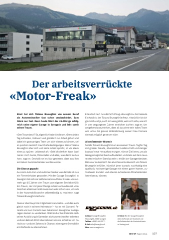 BEST OF BEST OF Region Albula Portrait xxx 1071 Der arbeitsverr%u00fcckte %u00abMotor-Freak%u00bbAdresse: Garage BruseghiniStradung 60, 7460 SavogninTelefon: +41 81 684 11 71E-Mail: info@bruseghini.chWeb: www.bruseghini.chIn K%u00fcrze: Bei der Garage Bruseghini steht die Freude am Handwerk und die Zufriedenheit der Kundschaft stets im Vordergrund.Einst hat sich Tiziano Bruseghini von seinem Beruf als Automechaniker fast schon verabschiedet. Zum Gl%u00fcck nur fast. Denn heute f%u00fchrt der 45-J%u00e4hrige erfolgreich seine eigene Garage in Savognin und lebt somit seinen Traum.%u00abDen Traumberuf? Ja, eigentlich habe ich diesen.%u00bb Denn jeden Tag zufrieden, motiviert und gl%u00fccklich zur Arbeit gehen und dabei ein grossartiges Team um sich wissen zu k%u00f6nnen, seien ja schon ziemlich traumhafte Bedingungen. Wenn Tiziano Bruseghini %u00fcber sich und seine Arbeit spricht, ist vor allem eines zu sp%u00fcren: Leidenschaft. %u00abSeit ich denken kann faszinieren mich Autos, Motorr%u00e4der und alles, was damit zu tun hat%u00bb, sagt er. Deshalb sei es klar gewesen, dass aus ihm einmal ein Automechaniker werden w%u00fcrde.Die Chance gepacktAus dem Auto-Fan und Automechaniker von damals ist nun ein Firmeninhaber geworden. Mit der Garage Bruseghini in Savognin hat sich der selbsternannte %u00abMotor-Freak%u00bb vor nunmehr gut 15 Jahren den Traum vom eigenen Betrieb erf%u00fcllt. Ein Traum, der mit jeder Menge Arbeit verbunden ist. %u00abEin bisschen arbeitsverr%u00fcckt muss man wohl schon sein, um sich in der Automobilbranche selbstst%u00e4ndig zu machen%u00bb, sagt Tiziano Bruseghini lachend. Dass er %u00fcberhaupt die M%u00f6glichkeit dazu hatte %u2013 und das auch gleich noch in seinem Heimatdorf %u2013 hat er mit Giovanni Peterelli und Luzi Carisch zwei bekannten Savogniner Autogaragen-Namen zu verdanken. W%u00e4hrend er bei Peterelli nach seiner Ausbildung in Samedan als Automechaniker arbeiten und den Betrieb 2010 %u00fcbernehmen konnte, erhielt er von Carisch vor rund drei Jahren die Chance, eine eigene Immobilie am Dorfende zu %u00fcbernehmen.Ebendort ziert nun der Schriftzug %u00abBruseghini%u00bb die Fassade. Ein Anblick, der Tiziano Bruseghini erfreut. %u00abNat%u00fcrlich bin ich gl%u00fccklich und ja, auch ein wenig stolz, wenn ich sehe, was ich in den vergangenen Jahren erreichen durfte%u00bb, sagt er. Um umgehend anzumerken, dass all das ohne sein tolles Team und ohne die grosse Unterst%u00fctzung seiner Frau Floriana niemals m%u00f6glich gewesen w%u00e4re.Allumfassender WunschSo lebt Tiziano Bruseghini nun also seinen Traum. Tag f%u00fcr Tag mit grosser Freude, ebensolcher Leidenschaft und stetiger Lust auf neue Herausforderungen. %u00abUnser Ziel ist es, uns als Garage m%u00f6glichst breit aufzustellen und stets auf dem neusten technischen Stand zu sein%u00bb, erkl%u00e4rt der Garagenbesitzer. Denn nur so l%u00e4sst sich der allumfassende Wunsch von Tiziano Bruseghini erf%u00fcllen. N%u00e4mlich jener danach, nachhaltig eine qualitativ hochwertige Garage mit einem guten Namen, zufriedenen Kunden und ebenso zufriedenen Mitarbeitenden betreiben zu k%u00f6nnen.