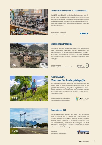 BEST OF BEST OF Voranzeigen Taser 92Zinsli Eisenwaren + Haushalt AGSeit 1955 steht Zinsli f%u00fcr ein breites Sortiment rund ums Zuhause %u2013 von der Kaffeemaschine bis zum M%u00e4hroboter. Das Familienunternehmen mit 25 Mitarbeitenden verbindet fundiertes Fachwissen und pers%u00f6nlichen Service. Ob Lieferung, Montage oder Beratung: Bei Zinsli gibts handfeste L%u00f6sungen und Markenqualit%u00e4t.GIUVAULTA Zentrum f%u00fcr Sonderp%u00e4dagogikGIUVAULTA unterst%u00fctzt Menschen mit Behinderungen auf ihrem Weg zur gr%u00f6sstm%u00f6glichen Selbstst%u00e4ndigkeit %u2013 mit pers%u00f6nlicher F%u00f6rderung, integrativen Angeboten und Wohnm%u00f6glichkeiten in Graub%u00fcnden. %u00dcber 300 Fachkr%u00e4fte arbeiten hier interdisziplin%u00e4r und mit viel Herzblut f%u00fcr ein respektvolles Miteinander.GIUVAULTA Zentrum f%u00fcr Sonderp%u00e4dagogik7405 Rothenbrunnen, www.giuvaulta.ch112Zinsli Eisenwaren + Haushalt AG7130 Ilanz, www.zinsli-ilanz.chResidenza PazzolaIn Disentis entsteht die Residenza Pazzola %u2013 ein nachhaltiges Holzhaus mit regionalem Holz aus Graub%u00fcnden. Von der Planung bis zur M%u00f6blierung steht Regionalit%u00e4t im Fokus, kombiniert mit modernster Technik, nachhaltiger Bauweise und authentischem Komfort. Zwei Wohnungen sind noch verf%u00fcgbar.Durschei Fiduziaria SA7180 Disentis/Must%u00e9r, www.residenza-pazzola.chInterkran AGWir sind Ihre Profi s rund um den Kran %u2013 von Vermietung %u00fcber Transporte bis zur technischen Unterst%u00fctzung bei anspruchsvollen Bauprojekten. Was mit einem Einmannbetrieb begann, ist heute ein moderner Betrieb mit %u00fcber 70%u00a0 Mitarbeitenden, modernem Maschinenpark und f%u00fcnf Standorten in der ganzen Schweiz. Kontaktieren Sie uns f%u00fcr eine unverbindliche Beratung.Interkran AG6345 Neuheim, www.interkran.ch1289486