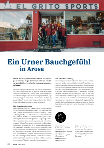 108 BEST OF BEST OF Portrait xxx Region PlessurEin Urner Bauchgef%u00fchl in ArosaAdresse: El Grito SportsDorf: Seeblickstrasse 1, 7050 Arosa +41 81 377 11 22Pr%u00e4tschli: Arlawaldweg, 7050 Arosa +41 79 479 99 43Alpine Club: Tannenweg, 7050 Arosa +41 81 378 58 00E-Mail: info@elgrito.chWeb: www.elgrito.chIn K%u00fcrze: Das El Grito Team bietet mit 30 Jahren Erfahrung im Wintersportbereich das ideale Rundum-Paket an. Ob es um Verleih, Verkauf oder einfach um eine Auffrischung von Schneesportger%u00e4ten und Zubeh%u00f6r geht %u2013 hier wird alles geboten.El Grito. Ein Name, den man kennt in Arosa. Genauso wie jenen von Heinz Herger. Gemeinsam mit seiner Frau hat der Urner Skilehrer im Schanfi gg etwas ganz Besonderes aufgebaut.Es ist schon ein bisschen verr%u00fcckt. Ein Urner Skilehrer kommt nach Arosa und er%u00f6ffnet dort als einer der Ersten einen Snowboard-Shop in einem alten Coiffeure-Salon. Eine Entscheidung, die er damals v%u00f6llig aus dem Bauch heraus getroffen habe, sagt er heute, knapp 30 Jahre sp%u00e4ter. Eine sinnvolle Entscheidung aus dem Bauch heraus. Heinz Herger und seine drei El Grito Shops sind heute untrennbar mit Arosa verbunden.Eine HerzensangelegenheitHeinz Herger erinnert sich daran, dass es immer intensive und aufregende Zeiten gewesen seien. Egal, welche H%u00f6hen oder Tiefen er zusammen mit seiner Frau Rebecca %u2013 die er in Arosa getroffen und mit der er vier erwachsene Kinder hat %u2013 erfahren durfte, die Leidenschaft und Hingabe f%u00fcr den Wintersport ist stets erhalten geblieben. Herger sagt: %u00abJeden Winter aufs Neue freut es mich ungemein, mit meiner Frau und dem El Grito-Team unsere Kundschaft im Gesch%u00e4ften willkommen zu heissen und sie zu beraten.%u00bb Eine Beratung, die alle Aspekte einbezieht. Egal, ob man Schneesportartikel leihen oder kaufen m%u00f6chte oder nach Sportbekleidung und Accessoires sucht %u2013 bei Heinz Herger und seinem Team wird man garantiert f%u00fcndig. Und das inzwischen an drei Standorten. Der umtriebige %u00abUrner in Arosa%u00bb konnte vor zwei Jahren an der Seeblickstrasse einen neuen Shop er%u00f6ffnen, wodurch er eine weitere Filiale im Herzen des Dorfes etablierte.Drei Jahrzehnte Erfahrung Heinz Herger %u00e4ussert sich zufrieden: %u00abDank des neuen Shops sowie der beiden weiteren Filialen im Hotel Pr%u00e4tschli und im Hotel Arosa Alpine Club k%u00f6nnen wir unseren Kundinnen und Kunden ein umfassendes Angebot machen.%u00bb Und das immer mit dem typischen Herger-Einsatz und einem Erfahrungsschatz von %u00fcber drei Jahrzehnten im Wintersport als Shopbetreiber, Skilehrer oder Skirennfahrer. Denn all dies und noch vieles mehr war beziehungsweise ist Heinz Herger. Der Urner, der vor rund 30 Jahren mit einer inneren %u00dcberzeugung nach Arosa kam und dort seine individuelle Erfolgsgeschichte schrieb. %u00dcbrigens ist es eine Erfolgsgeschichte, an der mit Jos mittlerweile auch die zweite Generation der Hergers mitwirkt.