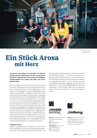 BEST OF BEST OF Region Plessur Portrait xxx 1091Ein St%u00fcck Arosa mit HerzAdresse: Arosershop / Schlittenk%u00f6nigGalerie Obersee Poststrasse 64, 7050 ArosaShop: +41 81 356 50 38, info@arosershop.chSchlittenk%u00f6nig: +41 76 673 35 68, info@schlittenkoenig.chWeb: www.arosershop.ch, www.schlittenkoenig.chIn K%u00fcrze: Ob Arosa-Souvenirs, trendige Arosa-Bekleidungen oder ein einzigartiges Schlittenangebot %u2013 im Arosershop, beim Aroser Schlittenk%u00f6nig, fi ndet man all das und noch vieles mehr.Ob Sommer oder Winter, im Arosershop von Manuela K%u00fcndig und ihrer Familie fi ndet man alles, was das ArosaHerz h%u00f6her schlagen l%u00e4sst. Hinzu kommt ein k%u00f6nigliches Schlittenangebot zum mieten und kaufen, das seinesgleichen sucht. Nein, sie bringe hier so schnell nichts mehr weg. Vor mittlerweile 25 Jahren gemeinsam mit der ganzen Familie aus dem z%u00fcrcherischen B%u00fclach in Arosa angekommen, ist der Ferienort im Schanfi gg f%u00fcr Manuela K%u00fcndig l%u00e4ngst zur geliebten Heimat geworden. Umgekehrt sind derweil f%u00fcr viele Einheimische und Touristen auch die K%u00fcndigs %u2013 dazu geh%u00f6ren neben Manuela und ihrer zw%u00f6lfj%u00e4hrigen Tochter Ma%u00eblle noch der Bruder Marcel sowie die Eltern Hans und Jolanda %u2013 nicht mehr aus dem Aroser Dorfbild wegzudenken. Denn der Name K%u00fcndig und die Marke Arosa geh%u00f6ren schlicht zusammen. Umso mehr, seit die Familie Ende 2021 den mitten im Dorfzentrum gelegenen Arosershop %u00fcbernommen hat und dort den Besucherinnen und Besuchern alles anbietet, was das Aroser-Herz nur so begehren kann. Angefangen von kleinen Arosa-Souvenirs %u00fcber Poster und Postkarten bis hin zu den klassischen Aroser-Schlitten oder Baby-, Kinder- und Erwachsenenbekleidung im Arosa-Style. Ein aussergew%u00f6hnliches Angebot, das %u00fcbrigens auch vollumf%u00e4nglich %u00fcber den Online-Arosershop abgerufen und bestellt werden kann.K%u00f6niglicher ServiceApropos aussergew%u00f6hnliches Angebot: Als solches kann mit Fug und Recht auch jenes des Schlittenk%u00f6nigs bezeichnet werden. Unter diesem Label bieten die K%u00fcndigs %u2013 wobei streng genommen haupts%u00e4chlich Vater Hans der Titel %u00abSchlittenk%u00f6nig%u00bb geb%u00fchrt %u2013 in den Wintermonaten einen ganz besonderen Schlittenservice an. Aus einem Stock von %u00fcber 200%u00a0Mietschlitten k%u00f6nnen hier die passenden Gef%u00e4hrte f%u00fcr unvergessliche Gruppen-, Firmen-, Vereins- oder auch Nachtschlitten-Erlebnisse ausgew%u00e4hlt werden. Und das Beste daran %u2013 beim Aroser Schlittenk%u00f6nig ist ab einer Bestellmenge von zehn Schlitten sogar noch ein exklusiver Bring- und Holservice inklusive. Ein wahrhaft k%u00f6niglicher Service.Bei der Familie K%u00fcndig packen alle mit an.