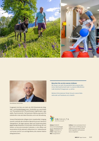 BEST OF BEST OF Region Viamala Portrait xxx 1132Adresse: GIUVAULTA Zentrum f%u00fcr Sonderp%u00e4dagogikIsla 34, 7405 Rothenbrunnen Telefon: +41 81 650 11 11E-Mail: info@giuvaulta.chWeb: www.giuvaulta.chIn K%u00fcrze: In den verschiedenen Einrichtungen, Schulen und Wohngruppen des GIUVAULTA werden derzeit rund 250 Kinder, Jugendliche und Erwachsene betreut und gef%u00f6rdert.Insgesamt sind bei uns mehr als 300 Mitarbeitende t%u00e4tig: Heil- und Sozialp%u00e4dagog:innen, Fachkr%u00e4fte aus verschiedenen Therapiebereichen (Physiotherapie, Ergotherapie, Logop%u00e4die, Psychomotorik), Fachpersonen Betreuung sowie Mitarbeitende in den zentralen Diensten und in der Verwaltung.Unsere Mitarbeitenden pflegen einen respektvollen Umgang, sowohl innerhalb der einzelnen Bereiche als auch bereichs%u00fcbergreifend. Sie legen grossen Wert auf Zusammenarbeit, gegenseitige Akzeptanz und zeitnahe Unterst%u00fctzung. Wir verstehen uns als eine lernende Institution, in der offene und konstruktive Kritik jederzeit willkommen ist. Lebensfreude und Humor sind f%u00fcr uns wichtige Werte, die unseren Arbeitsalltag bereichern.Gesch%u00e4ftsleiter Michael PetheBesuchen Sie uns bei unseren Anl%u00e4ssenWir freuen uns sehr, Sie pers%u00f6nlich bei unserem j%u00e4hrlichen Weihnachtsmarkt oder in unserem %u00f6ffentlichen Caf%u00e9 GIUVAULTA begr%u00fcssen zu d%u00fcrfen. Weitere Informationen fi nden Sie auf unserer Webseite oder auf Facebook und LinkedIn.