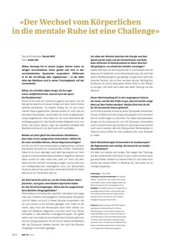 114 BEST OF BEST OF PromiText und Intervie Muriel WilliFoto: Swiss-SkiNiklas Hartweg hat in seinen jungen Jahren schon an einigen verschiedenen Orten gelebt und sich in den verschiedensten Sportarten ausprobiert. Mittlerweile ist der 25-J%u00e4hrige aber angekommen %u2013 in der Weltelite des Biathlons und in seiner Trainingsbasis auf der Lenzerheide.Niklas, Du schreibst eigene Songs, die Du sogar schon ver%u00f6ffentlicht hast. Kommt nach der Sportdie Musikkarriere?Musik ist f%u00fcr mich ein sch%u00f6ner Ausgleich zum Sport. Ich t%u00fcftele gerne abends an neuen Songs und kann damit meine Gef%u00fchle verarbeiten. Zu diesem Hobby bin ich kurz nach meiner Matura gekommen. Damals wollte ich mich voll auf den Sport fokussieren, wurde aber von einer Lungenentz%u00fcndung ausgebremst. Also habe ich mir eine alternative Besch%u00e4ftigung gesucht. Das Musikmachen begleitet mich nun schon seit sechs Jahren, aber als Standbein anstelle des Biathlons k%u00f6nnte ich mir die Musik nicht vorstellen.Bleiben wir doch gleich bei alternativen Standbeinen. Dein Vater ist ein erfolgreicher Unternehmer. H%u00e4ttest Du Dir auch vorstellen k%u00f6nnen, diesen Weg einzuschlagen?Ich bin mit der Firma meines Vaters aufgewachsen und fand das bereits als Kind ein inspirierendes Umfeld. Tats%u00e4chlich habe ich mir kurz %u00fcberlegt, nach dem Gymnasium ein Fernstudium in Wirtschaftswissenschaften in Angriff zu nehmen. Dann wurde mir aber rasch klar, dass ich mich voll dem Sport widmen m%u00f6chte. Schwierig zu sagen, wie es nach meiner Profi sportkarriere weitergehen wird. Ein Wirtschaftsstudium w%u00e4re sicher spannend, eventuell wechsle ich dann aber auch ins Trainerfach oder so.Als Kind warst Du nicht nur von der Firma Deines Vaters fasziniert, auch ganz verschiedene Sportarten haben Dir den %u00c4rmel hereingezogen. Wieso bist Du ausgerechnet beim Biathlon h%u00e4ngengeblieben?Meine Eltern sind beide sehr sportlich. Sie haben sich sogar %u00fcber den Triathlon kennengelernt. Meine %u00e4ltere Schwester und ich haben uns auch in dieser Sportart ausprobiert. Als wir von London in die Schweiz gezogen sind, habe ich bemerkt, dass mich der Wintersport noch mehr abholt. Ich habe mit Skifahren begonnen und dann auch mit meiner Schwester in den Biathlon hineingeschnuppert. Mir gefi el sofort, wie man dabei an die k%u00f6rperlichen Grenzen geht und sich so richtig auspowert. Als ich mit 12 Jahren die BiathlonWM als Zuschauer erleben konnte, hat mich die Sportart endg%u00fcltig in ihren Bann gezogen. Vor allem der Wechsel zwischen der Energie und dem Speed auf der Loipe und der Konzentration und Ruhe beim Schiessen ist beeindruckend an dieser Sportart. Wie gelingt es, so schnell den Schalter umzulegen?Dieser Wechsel von der k%u00f6rperlichen in die mentale H%u00f6chstleistung ist tats%u00e4chlich eine Herausforderung, die nicht bei jedem Wettkampf gleich gut gelingt. Es gibt auch keine bestimmte Technik, die ich hier verraten k%u00f6nnte. Wichtig f%u00fcrs Schiessen ist, durch bewusstes Atmen Ruhe in den K%u00f6rper zu bringen. Viel l%u00e4uft auch %u00fcber das stete Training und die Routine. Dieser Wechsel gelang Dir in den vergangenen Saisons als Junior und bei den Profi s so gut, dass Du bereits einige Male auf dem Podest standest. Welche Ziele hast Du Dir f%u00fcr die kommende Saison gesteckt?Ich durfte ja bereits einmal an einer Olympiade teilnehmen. Da war ich aber noch sehr jung und es ging f%u00fcr mich vor allem darum, Erfahrungen zu sammeln. F%u00fcr diese Olympiasaison bringe ich die Leistung mit, um auf Topniveau mitzuhalten, und im Sommertraining m%u00f6chte ich nochmals einen Schritt nach vorne machen. Bei den Olympischen Winterspielen in Milano / Cortina 2026 ist mein erkl%u00e4rtes Ziel, eine Medaille zu holen. Nach H%u00f6chstleistungen ist besonders im Ausdauersport die Regeneration sehr wichtig. Wo kannst Du am besten herunterfahren?Ich lebe nun bereits seit einiger Zeit wegen des Trainings auf der Lenzerheide. Hier f%u00fchle ich mich wohl und kann auch gut abschalten. Wirklich zu Hause f%u00fchle ich mich aber noch immer bei meinen Eltern in Wollerau SZ. Dort kann ich so richtig entspannen. %u00abDer Wechsel vom K%u00f6rperlichen in die mentale Ruhe ist eine Challenge%u00bbGeburtstag: 1. M%u00e4rz 2000Lieblingsort auf der Lenzerheide: Ich mag die Vielfalt %u2013 im Dorf kann man mitten unter Leuten einen Kaffee trinken, auf den Bergen fi ndet man Ruhe und auch am See vorne geniesse ich es.Vorbilder: Im Biathlon Johannes Thingnes B%u00f8, er verteidigte w%u00e4hrend Jahren auf h%u00f6chster sportlicher Ebene die Favoritenrolle. Roger Federer beeindruckt mich als Sportler und im bodenst%u00e4ndigen Umgang mit den Leuten.In K%u00fcrze: Niklas Hartweg wurde 2019 Jugendweltmeister im Biathlon Einzel. Im Winter 2022/23 gewann er die Auszeichnung f%u00fcr den besten Biathleten unter 25 Jahren. Nachdem er als Profi sportler an der Heim-Weltmeisterschaft im Februar 2025 das Podest mehrmals knapp verpasste, war er im M%u00e4rz auf der Pokljuka-Hochebene in Slowenien gemeinsam mit Aita Gasparin im Single-Mixed-Wettkampf siegreich.