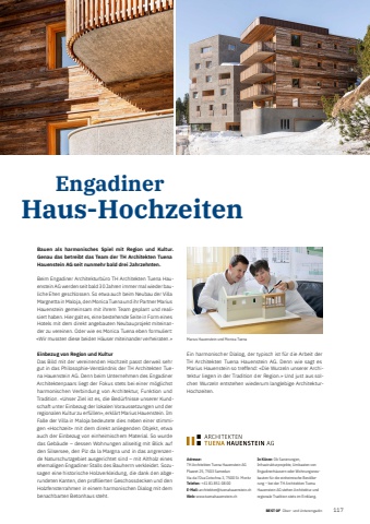 BEST OF Ober- und Unterengadin BEST OF Portrait xxx 1171Adresse:TH Architekten Tuena Hauenstein AGPlazzet 25, 7503 SamedanVia da l%u2019Ova Cotschna 3, 7500 St. MoritzTelefon: +41 81 851 08 00E-Mail: architekten@tuenahauenstein.chWeb: www.tuenahauenstein.chIn K%u00fcrze: Ob Sanierungen, Infrastruktur projekte, Umbauten von Engadinerh%u00e4usern oder Wohnungsneubauten f%u00fcr die einheimische Bev%u00f6lkerung %u2013 bei der TH Architekten Tuena Hauenstein AG stehen Architektur und regionale Tradition stets im Einklang. Engadiner Haus-HochzeitenBauen als harmonisches Spiel mit Region und Kultur. Genau das betreibt das Team der TH Architekten Tuena Hauenstein AG seit nunmehr bald drei Jahrzehnten.Beim Engadiner Architekturb%u00fcro TH Architekten Tuena Hauenstein AG werden seit bald 30 Jahren immer mal wieder bauliche Ehen geschlossen. So etwa auch beim Neubau der Villa Margnetta in Maloja, den Monica Tuena und ihr Partner Marius Hauenstein gemeinsam mit ihrem Team geplant und realisiert haben. Hier galt es, eine bestehende Seite in Form eines Hotels mit dem direkt angebauten Neubauprojekt miteinander zu vereinen. Oder wie es Monica Tuena eben formuliert: %u00abWir mussten diese beiden H%u00e4user miteinander verheiraten.%u00bbEinbezug von Region und KulturDas Bild mit der vereinenden Hochzeit passt derweil sehr gut in das Philosophie-Verst%u00e4ndnis der TH Architekten Tuena Hauenstein AG. Denn beim Unternehmen des Engadiner Architektenpaars liegt der Fokus stets bei einer m%u00f6glichst harmonischen Verbindung von Architektur, Funktion und Tradition. %u00abUnser Ziel ist es, die Bed%u00fcrfnisse unserer Kundschaft unter Einbezug der lokalen Voraussetzungen und der regionalen Kultur zu erf%u00fcllen%u00bb, erkl%u00e4rt Marius Hauenstein. Im Falle der Villa in Maloja bedeutete dies neben einer stimmigen %u00abHochzeit%u00bb mit dem direkt anliegenden Objekt, etwa auch der Einbezug von einheimischem Material. So wurde das Geb%u00e4ude %u2013 dessen Wohnungen allseitig mit Blick auf den Silsersee, den Piz da la Margna und in das angrenzende Naturschutzgebiet ausgerichtet sind %u2013 mit Altholz eines ehemaligen Engadiner Stalls des Bauherrn verkleidet. Sozusagen eine historische Holzverkleidung, die dank den abgerundeten Kanten, den profi lierten Geschossdecken und den Holzfensterrahmen in einem harmonischen Dialog mit dem benachbarten Betonhaus steht.Ein harmonischer Dialog, der typisch ist f%u00fcr die Arbeit der TH%u00a0 Architekten Tuena Hauenstein AG. Denn wie sagt es Marius Hauenstein so treffend: %u00abDie Wurzeln unserer Architektur liegen in der Tradition der Region.%u00bb Und just aus solchen Wurzeln entstehen wiederum langlebige ArchitekturHochzeiten.Marius Hauenstein und Monica Tuena
