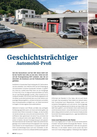 10 BEST OF BEST OF Portrait xxx %u00dcberregionalGeschichtstr%u00e4chtiger Automobil-Profi Seit drei Generationen und fast 100 Jahren dreht sich bei der Familie Senn alles um das Auto. Vieles hat sich seit der Firmengr%u00fcndung 1927 ver%u00e4ndert, aber die Leidenschaft, die Emotionen und die Professionalit%u00e4t sind geblieben. Autofahren in Graub%u00fcnden? Noch Anfang des 20. Jahrhunderts war das undenkbar. %u00abVon 1900 bis 1925 war die Fortbewegung mit Automobilen im Kanton Graub%u00fcnden verboten. Zu gef%u00e4hrlich, hiess es%u00bb, erz%u00e4hlt Hans-Peter Senn von der Autogarage H. P.%u00a0Senn%u00a0AG in Chur. Er zeigt auf historische Bilder von Autos, die von zwei Pferden gezogen wurden. %u00abMan musste kurz vor Landquart anhalten. Dort wurden zwei Pferde vorgespannt und mit diesen wurde das Automobil dann durch den Kanton zum jeweiligen Reiseziel gef%u00fchrt%u00bb, schildert er l%u00e4chelnd und erkl%u00e4rt, dass es beispielsweise unm%u00f6glich war, von Italien kommend im Engadin mit dem eigenen Auto weiterzufahren.W%u00e4hrend im Kanton noch Pferde und Bahn das wichtigste Fortbewegungsmittel waren und Autos als Exoten galten, absolvierte Hans-Peters Grossvater im Aargau, wo das Autofahren bereits erlaubt war, eine Lehre als Automechaniker. 1927 er%u00f6ffnete er dann gemeinsam mit seiner Frau und einem Gesellen in Landquart seine erste eigene Werkstatt %u2013 eine der ersten im Kanton. Seit der Firmengr%u00fcndung ist viel passiert. Drei Generationen der Familie Senn haben das Unternehmen gepr%u00e4gt und an moderne Anspr%u00fcche angepasst. Der urspr%u00fcngliche Standort an der Hauptstrasse in Landquart besteht seit 1930 und beherbergt heute noch eine Tankstelle. In den n%u00e4chsten Jahren ist dort eine umfassende Renovation geplant. 1954 kam der Standort in Chur dazu, den es auch heute noch gibt. Das kompetente Team bietet dort aktuell neben dem Autoverkauf auch Reparaturen, Zubeh%u00f6r sowie verschiedene Mietangebote rund ums Auto an. Die Autogarage H. P.%u00a0Senn%u00a0AG wird bereits seit 14 Jahren von Hans-Peter und K%u00e4thi Senn gef%u00fchrt, und mit Domenic Senn steht bereits die vierte Generation bereit. %u00abUnser Betrieb hat sich im Laufe der Jahre stetig weiterentwickelt und ist heute ein bedeutendes Automobil-Dienstleistungszentrum%u00bb, sagt Gesch%u00e4ftsf%u00fchrer Hans-Peter Senn. Autos sowie Reparaturen aller MarkenAuch das Angebot der H. P.%u00a0Senn%u00a0AG hat sich kontinuierlich erweitert. Verkauft werden Fahrzeuge aller Marken %u2013 ob neu oder Occasion. Der Gesch%u00e4ftsf%u00fchrer sieht das als grossen Mehrwert. In den letzten Jahren wurde zudem das Sortiment an E-Autos stetig ausgebaut. Vielseitig ist das Angebot