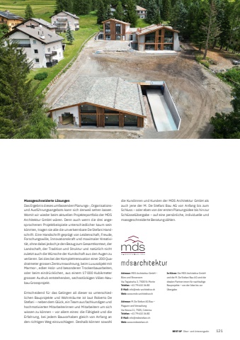 BEST OF Ober- und Unterengadin BEST OF Portrait xxx 1212Adresse: MDS Architektur GmbH %u2013 B%u00fcro und ShowroomVia Tegiatscha 3, 7500 St. MoritzTelefon: +41 79 610 36 80E-Mail: info@mds-architektur.chWeb: www.mds-architektur.chAdresse: M. De Stefani AG Bau %u2013 Magazin und VerwaltungVia Nouva 11, 7505, CelerinaTelefon: +41 79 610 36 80E-Mail: info@mdestefani.chWeb: www.mdestefani.chIn K%u00fcrze: Die MDS Architektur GmbH und die M. De Stefani Bau AG sind die idealen Partner:innen f%u00fcr nachhaltige Bauprojekte %u2013 von der Idee bis zur %u00dcbergabe.Massgeschneiderte L%u00f6sungenDas Ergebnis dieses umfassenden Planungs-, Organisationsund Ausf%u00fchrungsangebots kann sich derweil sehen lassen. Womit wir wieder beim aktuellen Projekteportfolio der MDS Architektur GmbH w%u00e4ren. Denn auch wenn die drei angesprochenen Projektbeispiele unterschiedlicher kaum sein k%u00f6nnten, tragen sie alle die unverkennbare De Stefani Handschrift. Eine Handschrift gepr%u00e4gt von Leidenschaft, Freude, Forschungswille, Innovationskraft und maximaler Kreativit%u00e4t, ohne dabei jedoch je den Bezug zum Gesamtkontext, der Landschaft, der Tradition und Struktur und nat%u00fcrlich nicht zuletzt auch die W%u00fcnsche der Kundschaft aus den Augen zu verlieren. Sei dies bei der Komplettrenovation einer 200%u00a0Quadratmeter grossen Zentrumswohnung, beim Luxusobjekt mit Marmor-, edlen Holz- und besonderen Trockenbauarbeiten, oder beim eindr%u00fccklichen, aus einem 17 000%u00a0Kubikmeter grossen Aushub entstehenden, sechs st%u00f6ckigen Villen-Neubau Grossprojekt. Entscheidend f%u00fcr das Gelingen all dieser so unterschiedlichen Bauprojekte und Wohntr%u00e4ume ist laut Roberto De Stefani %u2013 neben dem Gl%u00fcck, ein Team aus fachkundigen und hochmotivierten Mitarbeiterinnen und Mitarbeitern um sich wissen zu k%u00f6nnen %u2013 vor allem eines: die F%u00e4higkeit und die Erfahrung, bei jedem Bauvorhaben gleich von Anfang an den richtigen Weg einzuschlagen. Deshalb k%u00f6nnen sowohl die Kundinnen und Kunden der MDS Architektur GmbH als auch jene der M. De Stefani Bau AG von Anfang bis zum Schluss %u2013 oder eben von der ersten Planungsidee bis hin zur Schl%u00fcssel%u00fcbergabe %u2013 auf eine pers%u00f6nliche, individuelle und massgeschneiderte Beratung z%u00e4hlen.