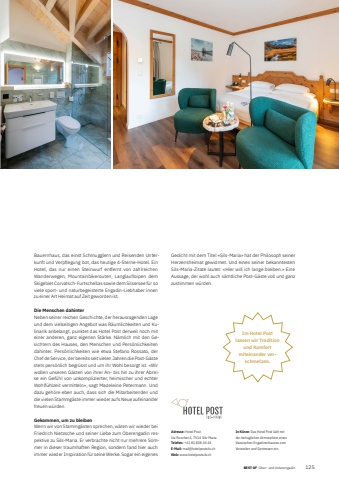 BEST OF Ober- und Unterengadin BEST OF Portrait xxx 1252Adresse: Hotel PostVia Runchet 4, 7514 Sils-MariaTelefon: +41 81 838 44 44E-Mail: mail@hotelpostsils.chWeb: www.hotelpostsils.chIn K%u00fcrze: Das Hotel Post l%u00e4dt mit der behaglichen Atmosph%u00e4re eines klassischen Engadinerhauses zum Verweilen und Geniessen ein.Bauernhaus, das einst Schmugglern und Reisenden Unterkunft und Verpflegung bot, das heutige 4-Sterne-Hotel. Ein Hotel, das nur einen Steinwurf entfernt von zahlreichen Wanderwegen, Mountainbikerouten, Langlaufloipen dem Skigebiet Corvatsch-Furtschellas sowie dem Silsersee f%u00fcr so viele sport- und naturbegeisterte Engadin-Liebhaber:innen zu einer Art Heimat auf Zeit geworden ist.Die Menschen dahinterNeben seiner reichen Geschichte, der herausragenden Lage und dem vielseitigen Angebot was R%u00e4umlichkeiten und Kulinarik anbelangt, punktet das Hotel Post derweil noch mit einer anderen, ganz eigenen St%u00e4rke. N%u00e4mlich mit den Gesichtern des Hauses, den Menschen und Pers%u00f6nlichkeiten dahinter. Pers%u00f6nlichkeiten wie etwa Stefano Rossato, der Chef de Service, der bereits seit vielen Jahren die Post-G%u00e4ste stets pers%u00f6nlich begr%u00fcsst und um ihr Wohl besorgt ist. %u00abWir wollen unseren G%u00e4sten von ihrer An- bis hin zu ihrer Abreise ein Gef%u00fchl von unkomplizierter, heimischer und echter Wohlf%u00fchlzeit vermitteln%u00bb, sagt Madeleine Petermann. Und dazu geh%u00f6re eben auch, dass sich die Mitarbeitenden und die vielen Stammg%u00e4ste immer wieder aufs Neue aufeinander freuen w%u00fcrden.Gekommen, um zu bleibenWenn wir von Stammg%u00e4sten sprechen, w%u00e4ren wir wieder bei Friedrich Nietzsche und seiner Liebe zum Oberengadin respektive zu Sils-Maria. Er verbrachte nicht nur mehrere Sommer in dieser traumhaften Region, sondern fand hier auch immer wieder Inspiration f%u00fcr seine Werke. Sogar ein eigenes Gedicht mit dem Titel %u00abSils-Maria%u00bb hat der Philosoph seiner Herzensheimat gewidmet. Und eines seiner bekanntesten Sils-Maria-Zitate lautet: %u00abHier will ich lange bleiben.%u00bb Eine Aussage, der wohl auch s%u00e4mtliche Post-G%u00e4ste voll und ganz zustimmen w%u00fcrden. Im Hotel Post lassen wir Tradition und Komfort mit einander verschmelzen.