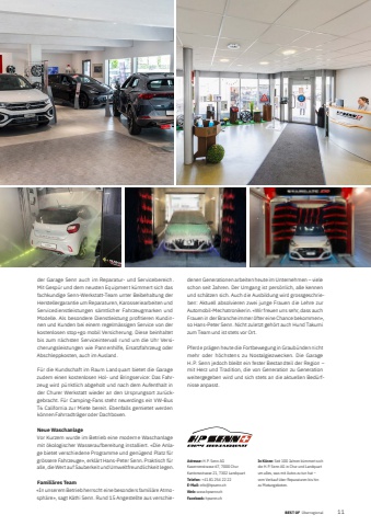 BEST OF BEST OF %u00dcberregional Portrait xxx 112Adresse: H. P.%u00a0Senn%u00a0AG Kasernenstrasse 67, 7000 Chur Kantonsstrasse 21, 7302 LandquartTelefon: +41 81 254 22 22E-Mail: info@hpsenn.chWeb: www.hpsenn.chFacebook: hpsenn.chIn K%u00fcrze: Seit 100 Jahren k%u00fcmmert sich die H. P.%u00a0Senn%u00a0AG in Chur und Landquart um alles, was mit Autos zu tun hat %u2013 vom Verkauf %u00fcber Reparaturen bis hin zu Mietangeboten.der Garage Senn auch im Reparatur- und Servicebereich. Mit Gesp%u00fcr und dem neusten Equipment k%u00fcmmert sich das fachkundige Senn-Werkstatt-Team unter Beibehaltung der Herstellergarantie um Reparaturen, Karosseriearbeiten und Servicedienstleistungen s%u00e4mtlicher Fahrzeugmarken und Modelle. Als besondere Dienstleistung profi tieren Kundinnen und Kunden bei einem regelm%u00e4ssigen Service von der kostenlosen stop+go mobil Versicherung. Diese beinhaltet bis zum n%u00e4chsten Serviceintervall rund um die Uhr Versicherungsleistungen wie Pannenhilfe, Ersatzfahrzeug oder Abschleppkosten, auch im Ausland.F%u00fcr die Kundschaft im Raum Landquart bietet die Garage zudem einen kostenlosen Hol- und Bringservice: Das Fahrzeug wird p%u00fcnktlich abgeholt und nach dem Aufenthalt in der Churer Werkstatt wieder an den Ursprungsort zur%u00fcckgebracht. F%u00fcr Camping-Fans steht neuerdings ein VW-Bus T6 California zur Miete bereit. Ebenfalls gemietet werden k%u00f6nnen Fahrradtr%u00e4ger oder Dachboxen.Neue WaschanlageVor Kurzem wurde im Betrieb eine moderne Waschanlage mit %u00f6kologischer Wasseraufbereitung installiert. %u00abDie Anlage bietet verschiedene Programme und gen%u00fcgend Platz f%u00fcr gr%u00f6ssere Fahrzeuge%u00bb, erkl%u00e4rt Hans-Peter Senn. Praktisch f%u00fcr alle, die Wert auf Sauberkeit und Umweltfreundlichkeit legen.Famili%u00e4res Team%u00abIn unserem Betrieb herrscht eine besonders famili%u00e4re Atmosph%u00e4re%u00bb, sagt K%u00e4thi Senn. Rund 15 Angestellte aus verschiedenen Generationen arbeiten heute im Unternehmen %u2013 viele schon seit Jahren. Der Umgang ist pers%u00f6nlich, alle kennen und sch%u00e4tzen sich. Auch die Ausbildung wird grossgeschrieben: Aktuell absolvieren zwei junge Frauen die Lehre zur Automobil-Mechatronikerin. %u00abWir freuen uns sehr, dass auch Frauen in der Branche immer %u00f6fter eine Chance bekommen%u00bb, so Hans-Peter Senn. Nicht zuletzt geh%u00f6rt auch Hund Takumi zum Team und ist stets vor Ort.Pferde pr%u00e4gen heute die Fortbewegung in Graub%u00fcnden nicht mehr oder h%u00f6chstens zu Nostalgiezwecken. Die Garage H. P.%u00a0Senn jedoch bleibt ein fester Bestandteil der Region %u2013 mit Herz und Tradition, die von Generation zu Generation weitergegeben wird und sich stets an die aktuellen Bed%u00fcrfnisse anpasst.