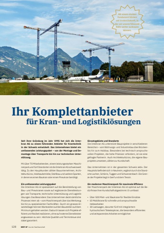 128 BEST OF BEST OF Portrait xxx Aus der NachbarschaftIhr Komplettanbieter f%u00fcr Kran- und Logistikl%u00f6sungenSeit ihrer Gr%u00fcndung im Jahr 1995 hat sich die Interkran%u00a0 AG zu einem f%u00fchrenden Anbieter f%u00fcr Krantechnik in der Schweiz entwickelt. Das Unternehmen bietet ein umfassendes Leistungspaket %u2013 von der Montage und Demontage %u00fcber Transporte bis hin zur technischen Unterst%u00fctzung.Mit %u00fcber 70 Mitarbeitenden, einem leistungsstarken Maschinenpark und f%u00fcnf Standorten ist die Interkran AG schweizweit t%u00e4tig. Zu den Hauptkunden z%u00e4hlen Bauunternehmen, Architekturb%u00fcros, Holzbaubetriebe, Stahlbau und weitere Sparten, in denen es einen Baukran oder einen Pneukran ben%u00f6tigt.Ein umfassendes LeistungspaketDie Interkran AG ist spezialisiert auf die Bereitstellung von Bau- und Pneukranen sowie auf erg%u00e4nzende Dienstleistungen wie Transporte, technische Unterst%u00fctzung und Logistikl%u00f6sungen. Das Besondere: Das Unternehmen deckt s%u00e4mtliche Prozesse intern ab %u2013 vom Maschinenpark %u00fcber das Werkzeug bis hin zu spezialisierten Fachkr%u00e4ften. Durch ein grosses Ersatzteillager k%u00f6nnen Wartezeiten auf den Baustellen auf dem Minimum gehalten werden. Dadurch lassen sich Projekte effi zient und flexibel realisieren, ohne auf externe Dienstleister angewiesen zu sein. H%u00f6chste Qualit%u00e4t und Termintreue sind dabei garantiert.Einsatzgebiete und StandorteDie Interkran AG unterst%u00fctzt Bauprojekte in verschiedenen Bereichen %u2013 vom Wohnungs- und Industriebau %u00fcber Br%u00fcckenbis hin zum Holzbau. Besonders bei technisch anspruchsvollen Projekten, die hohe Pr%u00e4zision erfordern, ist sie eine gefragte Partnerin. Auch Architekturb%u00fcros, die eigene Bauprojekte umsetzen, z%u00e4hlen zur Kundschaft.Das Unternehmen ist in der gesamten Schweiz aktiv. Der Hauptsitz befi ndet sich in Neuheim, erg%u00e4nzt durch die Standorte Lachen, Sch%u00e4nis, Tuggen und Schwerzenbach. Die Grenze der Projekte liegt in Genf und dem Tessin.Ein moderner Maschinenpark f%u00fcr maximale Effi zienzDer Maschinenpark der Interkran AG ist optimal auf die Bed%u00fcrfnisse ihrer Kundschaft abgestimmt. Er umfasst:%u2022 %u00dcber 500 Miet- und Baukrane f%u00fcr flexible Eins%u00e4tze%u2022 10 Mobilkrane f%u00fcr schnelle und anspruchsvolle Hebearbeiten%u2022 30 Lastwagen, darunter f%u00fcnf mit integriertem hydraulischem Teleskopkran, die besonders effi zientes und zeitsparendes Arbeiten erm%u00f6glichenMit einem starken Fundament blicken wir in eine Zukunft, in der wir unsere f%u00fchrende Rolle weiter ausbauen k%u00f6nnen.