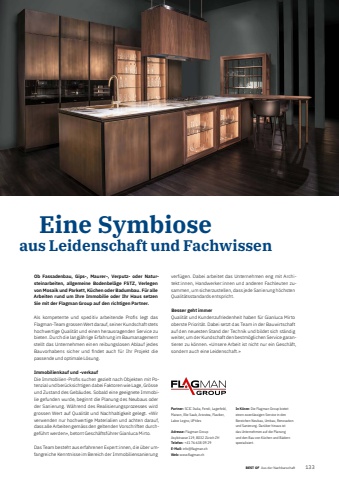 BEST OF Aus der Nachbarschaft BEST OF Portrait xxx 1334 Eine Symbioseaus Leidenschaft und FachwissenOb Fassadenbau, Gips-, Maurer-, Verputz- oder Natursteinarbeiten, allgemeine Bodenbel%u00e4ge FSTZ, Verlegen von Mosaik und Parkett, K%u00fcchen oder Badumbau. F%u00fcr alle Arbeiten rund um Ihre Immobilie oder Ihr Haus setzen Sie mit der Flagman Group auf den richtigen Partner.Als kompetente und speditiv arbeitende Profi s legt das Flagman- Team grossen Wert darauf, seiner Kundschaft stets hochwertige Qualit%u00e4t und einen herausragenden Service zu bieten. Durch die langj%u00e4hrige Erfahrung im Baumanagement stellt das Unternehmen einen reibungslosen Ablauf jedes Bauvorhabens sicher und fi ndet auch f%u00fcr Ihr Projekt die passende und optimale L%u00f6sung.Immobilienkauf und -verkaufDie Immobilien-Profi s suchen gezielt nach Objekten mit Potenzial und ber%u00fccksichtigen dabei Faktoren wie Lage, Gr%u00f6sse und Zustand des Geb%u00e4udes. Sobald eine geeignete Immobilie gefunden wurde, beginnt die Planung des Neubaus oder der Sanierung. W%u00e4hrend des Realisierungsprozesses wird grossen Wert auf Qualit%u00e4t und Nachhaltigkeit gelegt. %u00abWir verwenden nur hochwertige Materialien und achten darauf, dass alle Arbeiten gem%u00e4ss den geltenden Vorschriften durchgef%u00fchrt werden%u00bb, betont Gesch%u00e4ftsf%u00fchrer Gianluca Mirto.Das Team besteht aus erfahrenen Expert:innen, die %u00fcber umfangreiche Kenntnisse im Bereich der Immobiliensanierung Partner: SCIC Italia, Fendi, Lagerfeld, Maison, Elie Saab, Ariostea, Flaviker, Labor Legno, UPtilesAdresse: Flagman Group Asylstrasse 119, 8032 Z%u00fcrich ZHTelefon: +41 76 638 09 29E-Mail: info@flagman.chWeb: www.flagman.chIn K%u00fcrze: Die Flagman Group bietet einen zuverl%u00e4ssigen Service in den Bereichen Neubau, Umbau, Renovation und Sanierung. Dar%u00fcber hinaus ist das Unternehmen auf die Planung und den Bau von K%u00fcchen und B%u00e4dern spezialisiert.verf%u00fcgen. Dabei arbeitet das Unternehmen eng mit Architekt:innen, Handwerker:innen und anderen Fachleuten zusammen, um sicherzustellen, dass jede Sanierung h%u00f6chsten Qualit%u00e4tsstandards entspricht.Besser geht immerQualit%u00e4t und Kundenzufriedenheit haben f%u00fcr Gianluca Mirto oberste Priorit%u00e4t. Dabei setzt das Team in der Bauwirtschaft auf den neuesten Stand der Technik und bildet sich st%u00e4ndig weiter, um der Kundschaft den bestm%u00f6glichen Service garantieren zu k%u00f6nnen. %u00abUnsere Arbeit ist nicht nur ein Gesch%u00e4ft, sondern auch eine Leidenschaft.%u00bb