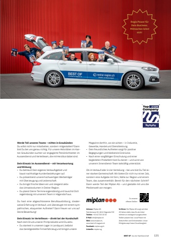 BEST OF Aus der Nachbarschaft 1352Werde Teil unseres Teams %u2013 mitten in Graub%u00fcndenDu willst nicht nur mitarbeiten, sondern mitgestalten? Dann bist Du bei uns genau richtig. F%u00fcr unsere Aktivit%u00e4ten im Kanton Graub%u00fcnden suchen wir engagierte Pers%u00f6nlichkeiten im Aussendienst und Verteilteam, die mit Herzblut dabei sind.Dein Einsatz im Aussendienst %u2013 mit Verantwortung und Wirkung%u2022 Du betreust Dein eigenes Verkaufsgebiet und baust nachhaltige Kundenbeziehungen auf.%u2022 Du pr%u00e4sentierst unsere hochwertigen Werbetr%u00e4ger mit %u00dcberzeugung und Leidenschaft.%u2022 Du bringst frische Ideen ein und steigerst aktiv das Umsatzvolumen in Deiner Region.%u2022 Du planst Deine Termine eigenst%u00e4ndig und tauschst Dich regelm%u00e4ssig mit unserem Team in H%u00e4gendorf aus.Du hast eine abgeschlossene Berufsausbildung, idealerweise Erfahrung im Verkauf, und %u00fcberzeugst mit einem sympathischen, eloquenten Auftreten? Dann freuen wir uns auf Deine Bewerbung!Dein Einsatz im Verteilteam %u2013 direkt bei der KundschaftNach dem Druck unserer Printprodukte wirst Du aktiv.%u2022 Du startest in unserem Lager in Landquart, bel%u00e4dst das bereitgestellte Firmenfahrzeug und bringst unsere Magazine dorthin, wo sie wirken %u2013 in Industrie, Gewerbe, Handel und Dienstleistung.%u2022 Dein freundliches Auftreten sorgt f%u00fcr positive Begegnungen und bleibende Eindr%u00fccke.%u2022 Nach einer sorgf%u00e4ltigen Einschulung und einer begleiteten Probefahrt bist Du bereit %u2013 und wirst von unserem Innendienst-Team tatkr%u00e4ftig unterst%u00fctzt.Ob im Verkauf oder in der Verteilung %u2013 bei uns bist Du Teil einer starken Gemeinschaft. Wir bieten Dir nicht nur einen Job, sondern eine Aufgabe mit Sinn, N%u00e4he zur Region und einem Team, das zusammenh%u00e4lt. Bereit f%u00fcr den n%u00e4chsten Schritt? Dann werde Teil der Miplan AG %u2013 und gestalte mit uns die Medienwelt von morgen.Adresse: Miplan AGFabrikstrasse 10, 4614 H%u00e4gendorf SOTelefon: +41 62 210 10 10E-Mail: info@miplan.chWeb: www.miplan.ch, www.best-of-magazin.chFacebook: miplan.ag.chLinkedIn: miplan-agIn K%u00fcrze: Die Miplan AG sorgt seit %u00fcber 45 Jahren daf%u00fcr, dass Du als Unternehmen an strategisch ausgesuchten Stellen pr%u00e4sent bist. Local Power mit Zeit schriften und Onlinemedien. Unser Erfolgskonzept heisst Zuverl%u00e4ssigkeit.CMYCMMYCYCMYKkununu_TopCompanyBadge_2025_CMYK Kopie.pdf 1 10.06.24 11:16Regio Power f%u00fcr Dein Business. Mitmachen lohnt sich!Zu unseren offenen Stellen:BEST OF Aus der Nachbarschaft