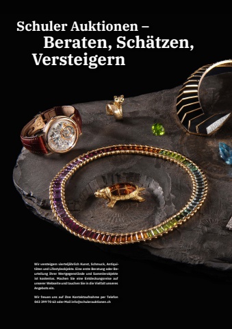 Wir versteigern viertelj%u00e4hrlich Kunst, Schmuck, Antiquit%u00e4ten und Lifestyleobjekte. Eine erste Beratung oder Beurteilung Ihrer Wertgegenst%u00e4nde und Sammlerobjekte ist kostenlos. Machen Sie eine Entdeckungsreise auf unserer Webseite und tauchen Sie in die Vielfalt unseres Angebots ein. Wir freuen uns auf Ihre Kontaktaufnahme per Telefon 043 399 70 63 oder Mail info@schulerauktionen.chSchuler Auktionen %u2013 Beraten, Sch%u00e4tzen, Versteigern