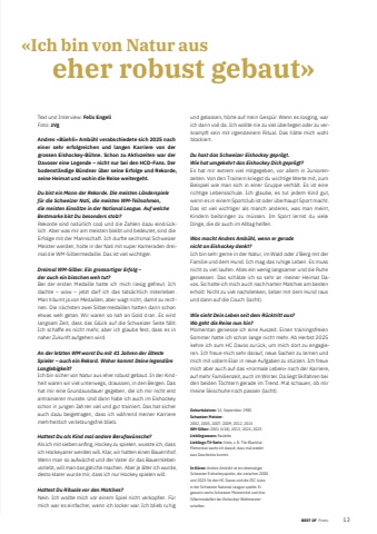 BEST OF BEST OF Promi 132Text und Intervie Felix Engeli Foto: zVg Andres %u00abB%u00fcehli%u00bb Amb%u00fchl verabschiedete sich 2025 nach einer sehr erfolgreichen und langen Karriere von der grossen Eishockey-B%u00fchne. Schon zu Aktivzeiten war der Davoser eine Legende %u2013 nicht nur bei den HCD-Fans. Der bodenst%u00e4ndige B%u00fcndner %u00fcber seine Erfolge und Rekorde, seine Heimat und wohin die Reise weitergeht. Du bist ein Mann der Rekorde. Die meisten L%u00e4nderspiele f%u00fcr die Schweizer Nati, die meisten WM-Teilnahmen, die meisten Eins%u00e4tze in der National League. Auf welche Bestmarke bist Du besonders stolz?Rekorde sind nat%u00fcrlich cool und die Zahlen dazu eindr%u00fccklich. Aber was mir am meisten bleibt und bedeutet, sind die Erfolge mit der Mannschaft. Ich durfte sechsmal Schweizer Meister werden, holte in der Nati mit super Kameraden dreimal die WM-Silbermedaille. Das ist viel wichtiger.Dreimal WM-Silber. Ein grossartiger Erfolg %u2013 der auch ein bisschen weh tut? Bei der ersten Medaille hatte ich mich riesig gefreut. Ich dachte %u2013 wow %u2013 jetzt darf ich das tats%u00e4chlich miterleben. Man tr%u00e4umt ja von Medaillen, aber wagt nicht, damit zu rechnen. Die n%u00e4chsten zwei Silbermedaillen hatten dann schon etwas weh getan. Wir waren so nah an Gold dran. Es wird langsam Zeit, dass das Gl%u00fcck auf die Schweizer Seite f%u00e4llt. Ich schaffe es nicht mehr, aber ich glaube fest, dass es in naher Zukunft aufgehen wird.An der letzten WM warst Du mit 41 Jahren der %u00e4lteste Spieler %u2013 auch ein Rekord. Woher kommt Deine legend%u00e4re Langlebigkeit?Ich bin sicher von Natur aus eher robust gebaut. In der Kindheit waren wir viel unterwegs, draussen, in den Bergen. Das hat mir eine Grundausdauer gegeben, die ich mir nicht erst antrainieren musste. Und dann habe ich auch im Eishockey schon in jungen Jahren viel und gut trainiert. Das hat sicher auch dazu beigetragen, dass ich w%u00e4hrend meiner Karriere mehrheitlich verletzungsfrei blieb.Hattest Du als Kind mal andere Berufsw%u00fcnsche?Als ich mit sieben anfi ng, Hockey zu spielen, wusste ich, dass ich Hockeyaner werden will. Klar, wir hatten einen Bauernhof. Wenn man so aufw%u00e4chst und der Vater dir das Bauernleben vorlebt, will man das gleiche machen. Aber je %u00e4lter ich wurde, desto klarer wurde mir, dass ich nur Hockey spielen will.Hattest Du Rituale vor den Matches?Nein. Ich wollte mich vor einem Spiel nicht verkopfen. F%u00fcr mich war es einfacher, wenn ich locker war. Ich blieb ruhig und gelassen, h%u00f6rte auf mein Gesp%u00fcr. Wenn es losging, war ich dann voll da. Ich wollte nie zu viel %u00fcberlegen oder zu verkrampft sein mit irgendeinem Ritual. Das h%u00e4tte mich wohl blockiert.Du hast das Schweizer Eishockey gepr%u00e4gt. Wie hat umgekehrt das Eishockey Dich gepr%u00e4gt? Es hat mir extrem viel mitgegeben, vor allem in Juniorenzeiten. Von den Trainern kriegst du wichtige Werte mit, zum Beispiel wie man sich in einer Gruppe verh%u00e4lt. Es ist eine richtige Lebensschule. Ich glaube, es tut jedem Kind gut, wenn es in einem Sportclub ist oder %u00fcberhaupt Sport macht. Das ist viel wichtiger als manch anderes, was man meint, Kindern beibringen zu m%u00fcssen. Im Sport lernst du viele Dinge, die dir auch im Alltag helfen.Was macht Andres Amb%u00fchl, wenn er gerade nicht an Eishockey denkt?Ich bin sehr gerne in der Natur, im Wald oder z%u2019Berg mit der Familie und dem Hund. Ich mag das ruhige Leben. Es muss nicht zu viel laufen. Alles ein wenig langsamer und die Ruhe geniessen. Das sch%u00e4tze ich so sehr an meiner Heimat Davos. So hatte ich mich auch nach harten Matches am besten erholt: Nicht zu viel nachdenken, lieber mit dem Hund raus und dann auf die Couch (lacht).Wie sieht Dein Leben seit dem R%u00fccktritt aus? Wo geht die Reise nun hin?Momentan geniesse ich eine Auszeit. Einen trainingsfreien Sommer hatte ich schon lange nicht mehr. Ab Herbst 2025 kehre ich zum HC Davos zur%u00fcck, um mich dort zu engagieren. Ich freue mich sehr darauf, neue Sachen zu lernen und mich mit vollem Elan in neue Aufgaben zu st%u00fcrzen. Ich freue mich aber auch auf das %u00abnormale Leben%u00bb nach der Karriere, auf mehr Familienzeit, auch im Winter. Da liegt Skifahren bei den beiden T%u00f6chtern gerade im Trend. Mal schauen, ob mir meine Skischuhe noch passen (lacht).Geburtsdatum: 14. September 1983Schweizer Meister: 2002, 2005, 2007, 2009, 2012, 2015WM-Silber: 2001 (U18), 2013, 2024, 2025Lieblingsessen: RacletteLieblings-TV-Serie: Viele, z. B. The Blacklist. Momentan warte ich darauf, dass mal wieder was Gescheites kommt.In K%u00fcrze: Andres Amb%u00fchl ist ein ehemaliger Schweizer Eishockeyspieler, der zwischen 2000 und 2025 f%u00fcr den HC Davos und die ZSC Lions in der Schweizer National League spielte. Er gewann sechs Schweizer Meistertitel und drei Silbermedaillen bei Eishockey-Weltmeisterschaften.%u00abIch bin von Natur aus eher robust gebaut%u00bb