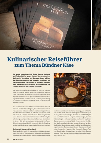14 BEST OF BEST OF Portrait xxx xxx %u00dcberregionalKulinarischer Reisef%u00fchrer zum Thema B%u00fcndner K%u00e4seDer Verein graub%u00fcndenVIVA f%u00f6rdert Genuss, Kulinarik und Regionalit%u00e4t im ganzen Kanton. Wir vernetzen Produzierende, Veredelnde und Geniesser:innen, st%u00e4rken die alpine Genusskultur und bespielen gemeinsam mit Partnern sinnvolle Plattformen. So entstehen Massnahmen, die den Wirtschaftsstandort Graub%u00fcnden %u00fcber die Themen Ern%u00e4hrung und Kulinarik profi lieren. Wer mit graub%u00fcndenVIVA unterwegs ist, taucht in das kulinarische Erbe der Region ein, entdeckt regionale Spezialit%u00e4ten, traditionelle Rezepte und die Geschichten hinter jeder Alp oder Dorfk%u00e4serei. Kurz: graub%u00fcndenVIVA inspiriert dazu, regionale Betriebe kennenzulernen, nachhaltige Ern%u00e4hrung zu sch%u00e4tzen und den Geschmack der Berge auf authentische Weise zu erleben.Aus diesem Geist heraus ist der Kulinarische Reisef%u00fchrer entstanden %u2013 ein handliches Magazin, das wir bereits zum dritten Mal zusammen mit dem Outdoor- und Reisemagazin Transhelvetica entwickelt haben. Im aktuellen Reisef%u00fchrer dreht sich alles um den K%u00e4se in Graub%u00fcnden. Wanderbegeisterte und E-Biker:innen sowie Kulinarikinteressierte fi nden Wegbeschreibungen zu Alpen, K%u00e4sereien, Hofl%u00e4den und Gastst%u00e4tten, in denen Milch seit Generationen veredelt wird. Der Reisef%u00fchrer ist kostenlos erh%u00e4ltlich; er versteht sich als Einladung an alle, Graub%u00fcnden unterwegs mit allen Sinnen zu entdecken.Ein Buch voll Aroma und HandwerkGleich zu Beginn macht ein mehrseitiges %u00abK%u00e4sblatt%u00bb Lust auf mehr: Rohmilch, Thermisierung, Reifegrade und Rindenpflege werden so klar erkl%u00e4rt, dass sogar K%u00e4seneulinge danach mitreden k%u00f6nnen. Ein Aroma-Rad zeigt, wie sich D%u00fcfte von frischer Milch %u00fcber Heu bis zu getrocknetem Steinpilz im Teig entwickeln. Es folgen Portr%u00e4ts von rund 120 Alpen und neun Dorfk%u00e4sereien %u2013 erg%u00e4nzt mit Reportagen, die den Arbeitsalltag in den Bergen sp%u00fcrbar machen. Wir begleiten Bianca Greiter, wenn sie auf 1800 Metern um vier Uhr fr%u00fch den Kupferkessel anheizt, oder schauen Chatrina Mair %u00fcber die Schulter, die im Unterengadin mit Schaf- und Geissmilch experimentiert. Zwischendurch liefern Rezeptseiten Inspiration f%u00fcr daheim: Malanser K%u00e4se-Weisswein-Suppe, Picknick-Crostini oder ein gluschtiges Surselva-Pl%u00e4ttli. Ebenso kommen Tipps, wo man die feinen K%u00e4se direkt selber kaufen kann, nicht zu kurz.14