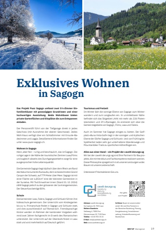 BEST OF BEST OF %u00dcberregional Portrait xxx 194Exklusives Wohnen in SagognDas Projekt Puoz Sagogn umfasst zwei 5 %u00bd-Zimmer Einfamilienh%u00e4user mit grossz%u00fcgigen Grundrissen und einer hochwertigen Ausstattung. Beide Wohnh%u00e4user bieten private Gartenfl%u00e4chen und Sitzpl%u00e4tze die zum Entspannen einladen. Der Personenlift f%u00fchrt von der Tiefgarage direkt in jedes Geschoss (mit Ausnahme der oberen Geschosse). Jedes Wohnhaus verf%u00fcgt %u00fcber ein Schlafzimmer mit Ensuite-Badezimmer und Loggia. Detailliertere Informationen fi nden Sie unter www.puoz-sagogn.ch.Wohnen in SagognKlein, aber fein %u2013 ruhig und beschaulich, das ist Sagogn. Die ruhige Lage in der N%u00e4he der touristischer Zentren Laax/Flims und zugleich abseits des Durchgangsverkehrs sorgt f%u00fcr eine ausgesprochen hohe Lebensqualit%u00e4t.Die Gemeinde Sagogn liegt idyllisch %u00fcber dem Rhein am Rand des Naturmonuments Ruinaulta, dem so bezeichneten Grand Canyon der Schweiz, auf 779 Meter %u00fcber Meer. Sagogn ist mit einer Fl%u00e4che von 6,85 km2 eine der kleinsten Gemeinden in der Surselva. Mit 764 Einwohner:innen (Stand 31. 12. 2024) z%u00e4hlt Sagogn jedoch zu den gr%u00f6sseren der 16 Kreisgemeinden. Der Steuerfuss betr%u00e4gt 80 %.SchuleDie Gemeinden Laax, Falera, Sagogn und Schluein f%u00fchren ihre Volksschule gemeinsam. Der Unterricht vom Kindergarten bis zur 6. Primarschule fi ndet in Sagogn und Schluein statt, und dies ausschliesslich auf Romanisch. Fremdsprachige Kinder werden im Rahmen der kantonalen Vorgaben w%u00e4hrend zwei Jahren fachgerecht im Erwerb des Romanischen unterst%u00fctzt. Der Unterricht auf der Oberstufe fi ndet in Laax statt und wird mehrheitlich auf Deutsch gef%u00fchrt. Tourismus und FreizeitIm Winter l%u00e4dt die sonnige Ebene von Sagogn zum Winterwandern und zum Langlaufen ein. In unmittelbarer N%u00e4he befi ndet sich das Skigebiet LAAX mit mehr als 224 Pistenkilometern und 29 Liftanlagen. Es erstreckt sich %u00fcber die Gemeindegebiete von Sagogn, Flims, Laax und Falera.Auch im Sommer hat Sagogn einiges zu bieten. Der Golfplatz %u00abBuna Vista Golf%u00bb liegt in der sonnigen und idyllischen Ebene der D%u00f6rfer Sagogn und Schluein. Und von Fr%u00fchling bis Sp%u00e4therbst laden sehr gut unterhaltene Wanderwege und Mountainbike-Trails zu sportlichen H%u00f6henfl%u00fcgen ein.Alles aus einer Hand %u2013 ein Projekt der cavelti derungs ag Wir bei der cavelti derungs ag sind Ihre Partnerin f%u00fcr Bauprojekte, die mit Herzblut und Fachkompetenz realisiert werden. Diese Philosophie spiegelt sich in all unseren Leistungen wider. Bauen ist unsere Leidenschaft. Interessiert? Kontaktieren Sie uns.Adresse: cavelti derungs%u00a0agVia Caplania 10, 7031 Laax Weitere Standorte:Stelleweg 4, 7000 Chur Glennerstrasse 10, 7130 IlanzTelefon: +41 81 925 35 15E-Mail: info@caveltiderungs.chWeb: www.caveltiderungs.chIn K%u00fcrze: Bauen ist unsere Leidenschaft. Wir sind Ihre Partnerin in den Bereichen Bauleitung, Planung, Energieberatung, Immobilienverwaltung, Schadstoffscreening und Brandschutz.Hier gehts zum Projekt!