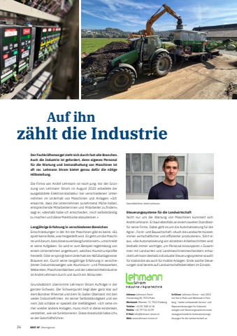 261 BEST OF BEST OF Portrait xxx %u00dcberregionalAdresse: Lehmann StromChr%u00fczerweg 20, 7074 MalixWerkstatt: Rheinstr. 71, 7012 FelsbergTelefon: +41 81 508 14 18Mobile: +41 79 710 44 59E-Mail: info@lehmann-strom.chWeb: www.lehmann-strom.chIn K%u00fcrze: Lehmann Strom %u2013 seit 2024 mit Sitz in Malix und Werkstatt in Felsberg %u2013 bietet umfassende Service- und Reparaturleistungen f%u00fcr Industrieanlagen und Steuerungssysteme sowie massgeschneiderte Automatisierungsl%u00f6sungen f%u00fcr die Landwirtschaft an.Der Fachkr%u00e4ftemangel zieht sich durch fast alle Branchen. Auch die Industrie ist gefordert, denn eigenes Personal f%u00fcr die Wartung und Instandhaltung von Maschinen ist oft rar. Lehmann Strom bietet genau daf%u00fcr die n%u00f6tige Hilfe stellung.Die Firma von Andr%u00e9 Lehmann ist noch jung. Vor der Gr%u00fcndung von Lehmann Strom im August 2022 arbeitete der ausgebildete Elektroinstallateur bei verschiedenen Unternehmen im Unterhalt von Maschinen und Anlagen. %u00abIch erkannte, dass die Unternehmen zunehmend M%u00fche haben, entsprechende Mitarbeiterinnen und Mitarbeiter zu fi nden%u00bb, sagt er, %u00abdeshalb habe ich entschieden, mich selbstst%u00e4ndig zu machen und diese Marktl%u00fccke abzudecken.%u00bbLangj%u00e4hrige Erfahrung in verschiedenen BereichenEinschr%u00e4nkungen in der Art der Maschinen gibt es keine. %u00abEs spielt keine Rolle, was hergestellt wird. Es geht um die Maschine und darum, dass diese zuverl%u00e4ssig funktioniert%u00bb, umschreibt er seine Aufgaben. So wird er zum Beispiel regelm%u00e4ssig von einem Unternehmen angeheuert, welches Aluminiumprofi le herstellt. Oder er springt beim Unterhalt der Abf%u00fcllanlage einer Brauerei ein. Durch seine langj%u00e4hrige Erfahrung in verschiedenen Industriezweigen wie Aluminium- und Presswerken, Webereien, Maschinenfabriken und der Lebensmittelindustrie ist Andr%u00e9 Lehmann durch und durch ein Allrounder.Grunds%u00e4tzlich %u00fcbernimmt Lehmann Strom Auftr%u00e4ge in der ganzen Schweiz. Der Schwerpunkt liegt aber ganz klar auf dem B%u00fcndner Rheintal und dem St. Galler Oberland mit den vielen Industriefi rmen. An seiner Selbstst%u00e4ndigkeit und seinem Job sch%u00e4tze er speziell die Vielf%u00e4ltigkeit. %u00abIch sehe immer wieder andere Anlagen, muss mich in diese eindenken, verstehen, wie sie funktionieren. Diese Kreativit%u00e4t liebe ich%u00bb, so der Gesch%u00e4ftsf%u00fchrer.Steuerungssysteme f%u00fcr die LandwirtschaftNicht nur um die Wartung von Maschinen k%u00fcmmert sich Andr%u00e9 Lehmann. Er baut ebenfalls an einem zweiten Standbein f%u00fcr seine Firma. Dabei geht es um die Automatisierung f%u00fcr die Agrar-, Forst- und Bauwirtschaft. %u00abAuch die Landwirte m%u00fcssen immer wirtschaftlicher und effi zienter produzieren%u00bb, f%u00fchrt er aus, %u00abdie Automatisierung von einzelnen Arbeitsschritten wird deshalb immer wichtiger, um Personal einzusparen.%u00bb Zusammen mit Landwirten und Landmaschinenmechanikern entwickelt Lehmann deshalb individuelle Steuerungssysteme sowohl f%u00fcr station%u00e4re als auch f%u00fcr mobile Anlagen. Erste solche Steuerungen sind bereits auf Landwirtschaftsbetrieben im Einsatz.Gesch%u00e4ftsf%u00fchrer Andr%u00e9 Lehmann Auf ihn z%u00e4hlt die Industrie