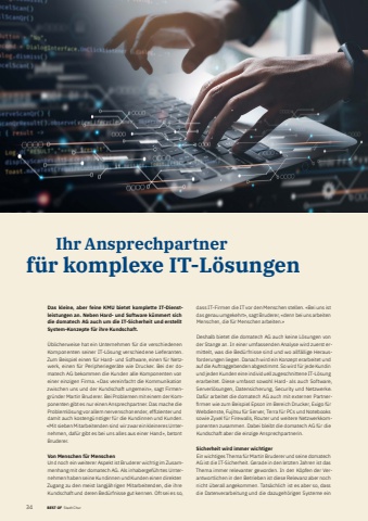 341 BEST OF BEST OF xxx Stadt Chur Ihr Ansprechpartner f%u00fcr komplexe IT-L%u00f6sungenDas kleine, aber feine KMU bietet komplette IT-Dienstleistungen an. Neben Hard- und Software k%u00fcmmert sich die domatech AG auch um die IT-Sicherheit und erstellt System-Konzepte f%u00fcr ihre Kundschaft.%u00dcblicherweise hat ein Unternehmen f%u00fcr die verschiedenen Komponenten seiner IT-L%u00f6sung verschiedene Lieferanten. Zum Beispiel einen f%u00fcr Hard- und Software, einen f%u00fcr Netzwerk, einen f%u00fcr Peripherieger%u00e4te wie Drucker. Bei der domatech AG bekommen die Kunden alle Komponenten von einer einzigen Firma. %u00abDas vereinfacht die Kommunikation zwischen uns und der Kundschaft ungemein%u00bb, sagt Firmengr%u00fcnder Martin Bruderer. Bei Problemen mit einem der Komponenten gibt es nur einen Ansprechpartner. Das mache die Probleml%u00f6sung vor allem nervenschonender, effi zienter und damit auch kosteng%u00fcnstiger f%u00fcr die Kundinnen und Kunden. %u00abMit sieben Mitarbeitenden sind wir zwar ein kleineres Unternehmen, daf%u00fcr gibt es bei uns alles aus einer Hand%u00bb, betont Bruderer.Von Menschen f%u00fcr MenschenUnd noch ein weiterer Aspekt ist Bruderer wichtig im Zusammenhang mit der domatech AG. Als inhabergef%u00fchrtes Unternehmen haben seine Kundinnen und Kunden einen direkten Zugang zu den meist langj%u00e4hrigen Mitarbeitenden, die ihre Kundschaft und deren Bed%u00fcrfnisse gut kennen. Oft sei es so, dass IT-Firmen die IT vor den Menschen stellen. %u00abBei uns ist das genau umgekehrt%u00bb, sagt Bruderer, %u00abdenn bei uns arbeiten Menschen, die f%u00fcr Menschen arbeiten.%u00bbDeshalb bietet die domatech AG auch keine L%u00f6sungen von der Stange an. In einer umfassenden Analyse wird zuerst ermittelt, was die Bed%u00fcrfnisse sind und wo allf%u00e4llige Herausforderungen liegen. Danach wird ein Konzept erarbeitet und auf die Auftraggebenden abgestimmt. So wird f%u00fcr jede Kundin und jeden Kunden eine individuell zugeschnittene IT-L%u00f6sung erarbeitet. Diese umfasst sowohl Hard- als auch Software, Serverl%u00f6sungen, Datensicherung, Security und Netzwerke. Daf%u00fcr arbeitet die domatech AG auch mit externen Partnerfi rmen wie zum Beispiel Epson im Bereich Drucker, Exigo f%u00fcr Webdienste, Fujitsu f%u00fcr Server, Terra f%u00fcr PCs und Notebooks sowie Zyxel f%u00fcr Firewalls, Router und weitere Netzwerkkomponenten zusammen. Dabei bleibt die domatech AG f%u00fcr die Kundschaft aber die einzige Ansprechpartnerin.Sicherheit wird immer wichtigerEin wichtiges Thema f%u00fcr Martin Bruderer und seine domatech AG ist die IT-Sicherheit. Gerade in den letzten Jahren ist das Thema immer relevanter geworden. In den K%u00f6pfen der Verantwortlichen in den Betrieben ist diese Relevanz aber noch nicht %u00fcberall angekommen. Tats%u00e4chlich ist es aber so, dass die Datenverarbeitung und die dazugeh%u00f6rigen Systeme ein 34
