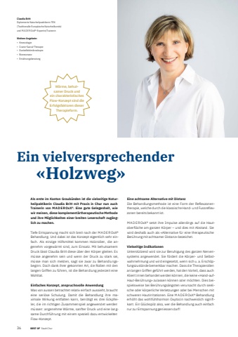 361 BEST OF BEST OF Portrait xxx Stadt ChurEin vielversprechender %u00abHolzweg%u00bbAls erste im Kanton Graub%u00fcnden ist die vielseitige Naturheilpaktikerin Claudia Britt mit Praxis in Chur nun auch Trainerin von M A D E R OxX%u00ae. Eine gute Gelegenheit, wie wir meinen, diese komplement%u00e4rtherapeutische Methode und ihre M%u00f6glichkeiten einer breiten Leserschaft zug%u00e4nglich zu machen. Tiefe Entspannung macht sich breit nach der M A D E R OxX%u00ae Behandlung. Und dabei ist das Konzept eigentlich sehr einfach. Als einzige Hilfsmittel kommen Holzrollen, die angenehm vorgew%u00e4rmt sind, zum Einsatz. Mit behutsamem Druck l%u00e4sst Claudia Britt diese %u00fcber den K%u00f6rper gleiten. Es m%u00fcsse angenehm sein und wenn der Druck zu stark sei, m%u00fcsse man sich melden, sagt sie zwar zu Behandlungsbeginn. Doch dank ihrer gekonnten Art, die Rollen mit den langen Griffen zu f%u00fchren, ist die Behandlung jederzeit eine Wohltat.Einfaches Konzept, anspruchsvolle Anwendung Was von aussen betrachtet relativ einfach aussieht, braucht eine seri%u00f6se Schulung. Damit die Behandlung ihre maximale Wirkung entfalten kann, ben%u00f6tigt es drei Eckpfeiler, die im richtigen Zusammenspiel angewendet werden m%u00fcssen: angenehme W%u00e4rme, sanfter Druck und eine langsame Durchf%u00fchrung mit einem speziell dazu entwickelten Flow-Konzept. Eine achtsame Alternative mit DistanzDie Behandlungsmethode ist eine Form der Reflexzonentherapie, welche durch die klassische Hand- und Fussreflexzonen bereits bekannt ist. M A D E R OxX%u00ae setzt ihre Impulse allerdings auf die Hautoberfl%u00e4che am ganzen K%u00f6rper %u2013 und dies mit Abstand. Sie wird deshalb auch als %u00abAlternative f%u00fcr eine therapeutische Ber%u00fchrung mit achtsamer Distanz%u00bb bezeichet. Vielseitige Indikationen Unterst%u00fctzend wird sie zur Beruhigung des ganzen Nervensystems angewendet. Sie f%u00f6rdert die K%u00f6rper- und Selbstwahrnehmung und wird eingesetzt, wenn sich u. a. Ersch%u00f6pfungszust%u00e4nde bemerkbar machen. Dass die Therapierollen an langen Griffen gef%u00fchrt werden, hat den Vorteil, dass auch Klient:innen behandet werden k%u00f6nnen, die keine %u00abHand-aufHaut-Ber%u00fchrung%u00bb zulassen k%u00f6nnen oder m%u00f6chten. Dies beispielsweise bei Ber%u00fchrungs%u00e4ngsten verursacht durch seelische oder k%u00f6rperliche Verletzungen oder bei Menschen mit schweren Hautirritationen. Eine M A D E R OxX%u00ae Behandlung erh%u00f6ht das wohlf%u00fchlhormon Oxytocin nachweislich signifi -kant. Ein Gl%u00fcckspilz also, wer die Behandlung auch einfach nur zur Entspannung geniessen darf!W%u00e4rme, behutsamer Druck und ein charakteristisches Flow-Konzept sind die Erfolgsfaktoren dieser Therapieform.Claudia Britt Diplomierte Naturheilpraktikerin TEN (Traditionalle Europ%u00e4ische Naturheilkunde) und M A D E R OxX%u00ae-Expertin/TrainerinWeitere Angebote:%u2022 Kinesiologie%u2022 Cranio-Sacral-Therapie%u2022 Dunkelfeldmikroskopie%u2022 Bioresonanz%u2022 Ern%u00e4hrungsberatung