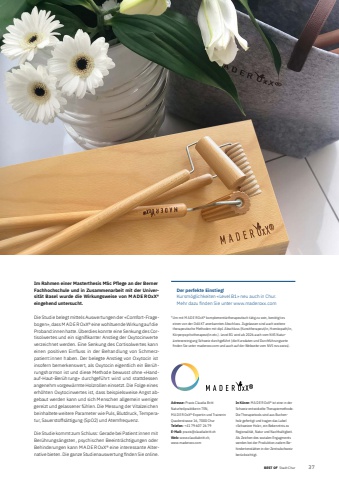 BEST OF BEST OF Portrait xxx Stadt Chur 372Adresse: Praxis Claudia BrittNaturheil praktikerin TEN, M A D E R OxX%u00ae-Expertin und TrainerinQuaderstrasse 16, 7000 Chur Telefon: +41 79 607 26 79E-Mail: praxis@claudiabritt.chWeb: www.claudiabritt.ch, www.maderoxx.comIn K%u00fcrze: M A D E R OxX%u00ae ist eine in der Schweiz entwickelte Therapiemethode. Die Therapietools sind aus Buchenholz gefertigt und tragen das Label %u00abSchweizer Holz%u00bb, ein Bekenntnis zu Regionalit%u00e4t, Natur und Nachhaltigkeit. Als Zeichen des sozialen Engagments werden bei der Produktion zudem Behindertenst%u00e4tten in der Zentralschweiz ber%u00fccksichtigt.Im Rahmen einer Masterthesis MSc Pflege an der Berner Fachhochschule und in Zusammenarbeit mit der Universit%u00e4t Basel wurde die Wirkungsweise von M A D E R OxX%u00ae eingehend untersucht.Die Studie belegt mittels Auswertungen der %u00abComfort-Fragebogen%u00bb, dass M A D E R OxX%u00ae eine wohltuende Wirkung auf die Proband:innen hatte. %u00dcberdies konnte eine Senkung des Cortisolwertes und ein signifi kanter Anstieg der Oxytocinwerte verzeichnet werden. Eine Senkung des Cortisolwertes kann einen positiven Einfluss in der Behandlung von Schmerzpatient:innen haben. Der belegte Anstieg von Oxytocin ist insofern bemerkenswert, als Oxytocin eigentlich ein Ber%u00fchrungshormon ist und diese Methode bewusst ohne %u00abHandauf-Haut-Ber%u00fchrung%u00bb durchgef%u00fchrt wird und stattdessen angenehm vorgew%u00e4rmte Holzrollen einsetzt. Die Folge eines erh%u00f6hten Oxytocinwertes ist, dass beispielsweise Angst abgebaut werden kann und sich Menschen allgemein weniger gereizt und gelassener f%u00fchlen. Die Messung der Vitalzeichen beinhaltete weitere Parameter wie Puls, Blutdruck, Temperatur, Sauerstoffs%u00e4ttigung (SpO2) und Atemfrequenz. Die Studie kommt zum Schluss: Gerade bei Patient:innen mit Ber%u00fchrungs%u00e4ngsten, psychischen Beeintr%u00e4chtigungen oder Behinderungen kann M A D E R OxX%u00ae eine interessante Alternative bieten. Die ganze Studienauswertung fi nden Sie online.Der perfekte Einstieg!Kursm%u00f6glichkeiten %u00abLevel B1%u00bb neu auch in Chur. Mehr dazu fi nden Sie unter www.maderoxx.com* Um mit M A D E R OxX%u00ae komplement%u00e4rtherapeutisch t%u00e4tig zu sein, ben%u00f6tigt es einen von der OdA KT anerkannten Abschluss. Zugelassen sind auch weitere therapeutische Methoden mit dipl. Abschluss (Kunsttherapeut/in, Hom%u00f6opath/in, K%u00f6rperpsychotherapeut/in etc.). Level B1 wird ab 2026 auch vom NVS Natur%u00e4rztevereinigung Schweiz durchgef%u00fchrt (die Kursdaten und Durchf%u00fchrungsorte fi nden Sie unter maderoxx.com und auch auf der Webseite vom NVS nvs.swiss).