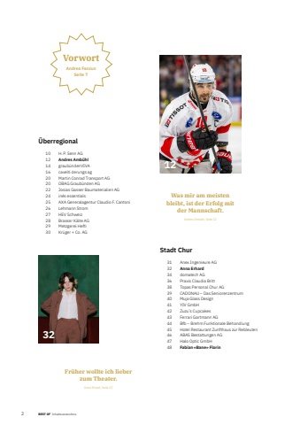 2 BEST OF Inhaltsverzeichnis%u00dcberregional10 H.P. Senn AG12 Andres Amb%u00fchl14 graub%u00fcndenVIVA16 cavelti derungs ag20 Martin Conrad Transport AG20 OBAG Graub%u00fcnden AG22 Josias Gasser Baumaterialien AG24 in%u00e9s essentials25 AXA Generalagentur Claudio F. Cantoni26 Lehmann Strom27 HEV Schweiz28 Brasser K%u00e4lte AG29 Metzgerei Hefti30 Kr%u00fcger + Co. AGStadt Chur31 Anex Ingenieure AG32 Anna Erhard34 domatech AG36 Praxis Claudia Britt38 Topas Personal Chur AG39 CADONAU %u2013 Das Seniorenzentrum40 Muja Glass Design41 YIV GmbH42 Zuzu%u2019s Cupcakes43 Ferrari Gartmann AG44 Bfb %u2013 Brehm Funktionale Behandlung45 Hotel Restaurant Zunfthaus zur Rebleuten46 ABAS Bestattungen AG47 Halo Optic GmbH48 Fabian %u00abBane%u00bb FlorinVorwortAndrea FanzunSeite 732Was mir am meisten bleibt, ist der Erfolg mit der Mannschaft.Andres Amb%u00fchl, Seite 12Fr%u00fcher wollte ich lieber zum Theater.Anna Erhard, Seite 3212