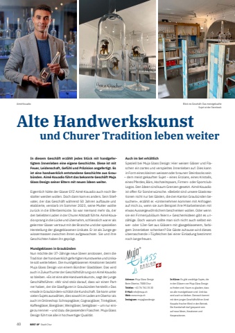 401 BEST OF BEST OF Portrait xxx Stadt ChurAlte Handwerkskunst und Churer Tradition leben weiterAdresse: Muja Glass DesignBeim Obertor, 7000 ChurTelefon: +41 76 761 35 30E-Mail: info@muja.chWeb: www.muja.chInstagram: mujaglassdesignIn K%u00fcrze: Es gibt unz%u00e4hlige Sujets, die in den Gl%u00e4sern von Muja Glass Design zu fi nden sind. Kaum zu glauben, dass sie alle mundgeblasen sind. Und das wird auch so bleiben. Dennoch kommt mit dem jungen Gesch%u00e4ftsf%u00fchrer Aim%u00e9 Kouadio frischer Wind in den Betrieb. Die Kundschaft darf gespannt sein auf neue Ideen, Kreationen und Kooperationen. In diesem Gesch%u00e4ft erz%u00e4hlt jedes St%u00fcck mit handgefertigtem Innenleben eine eigene Geschichte. Diese ist mit Feuer, Leidenschaft, Gef%u00fchl und Pr%u00e4zision angefertigt. Es ist eine handwerklich entstandene Geschichte aus Graub%u00fcnden. Aim%u00e9 Kouadio f%u00fchrt das bekannte Gesch%u00e4ft Muja Glass Design seiner Eltern mit neuen Ideen weiter. Eigentlich h%u00e4tte der Glaser EFZ Aim%u00e9 Kouadio auch noch Bestatter werden wollen. Doch dann kam es anders. Sein Stiefvater, der das Gesch%u00e4ft w%u00e4hrend 50 Jahren aufbaute und etablierte, verstarb im Sommer 2023, seine Mutter wollte zur%u00fcck in die Elfenbeink%u00fcste. So war niemand mehr da, der den beliebten Laden in der Churer Altstadt f%u00fchrte. Aim%u00e9 Kouadio sprang in die L%u00fccke und %u00fcbernahm, schliesslich war er als gelernter Glaser vertraut mit der Branche und der speziellen Herstellung der glasgeblasenen Unikate. Er ist als Junge gewissermassen zwischen ihnen aufgewachsen. Sie und ihre Geschichten haben ihn gepr%u00e4gt. Mundgeblasen in Graub%u00fcnden Nun m%u00f6chte der 37-J%u00e4hrige neue Ideen anstossen, denn die Tradition der handwerklich gefertigten Kunstwerke und Unikate soll weiterleben. Die mundgeblasenen Kreationen bezieht Muja Glass Design von einem B%u00fcndner Glasbl%u00e4ser. Das wird auch in Zukunft unter der Gesch%u00e4ftsf%u00fchrung von Aim%u00e9 Kouadio so bleiben. %u00abEs ist eine alte Handwerkskunst%u00bb, sagt der junge Gesch%u00e4ftsf%u00fchrer. %u00abWir sind stolz darauf, dass wir einen Partner haben, der die Glasfi guren in Graub%u00fcnden herstellt.%u00bb Das %u00abmade in Graub%u00fcnden%u00bb sch%u00e4tzt die Kundschaft. Sie kann unter vielen Sujets ausw%u00e4hlen, dies sowohl im Laden am Obertor als auch im Onlineshop: Schnapsgl%u00e4ser, Cognacgl%u00e4ser, Trinkgl%u00e4ser, Kaffeegl%u00e4ser, Biergl%u00e4ser, Weingl%u00e4ser, Sektgl%u00e4ser %u2013 um nur einige zu nennen %u2013 und dazu die passenden Flaschen. Muja Glass Design f%u00fchrt sie alle in hochwertiger Qualit%u00e4t. Auch im Set erh%u00e4ltlich Speziell bei Muja Glass Design: Hier weisen Gl%u00e4ser und Flaschen ein zartes und verspieltes Innenleben auf. Dies kann in Form eines kleinen weissen oder braunen Steinbocks sein %u2013 dem meist gekauften Sujet %u2013 eines Enzians, eines Kristalls, eines Pferdes, B%u00e4rs, Hochzeitspaars, Firmen- oder SportclubLogos. Den Ideen sind kaum Grenzen gesetzt. Aim%u00e9 Kouadio ist offen f%u00fcr Sonderw%u00fcnsche. %u00abBeliebt sind unsere Glaskreationen nicht nur bei G%u00e4sten, die den Kanton Graub%u00fcnden besuchen%u00bb, erz%u00e4hlt er. %u00abUnternehmen kommen mit Anfragen auf mich zu, wenn sie zum Beispiel ihre Mitarbeitenden mit etwas Aussergew%u00f6hnlichem beschenken wollen. Oder wenn sie ein Firmenjubil%u00e4um feiern.%u00bb Geschenkideen gibt es unz%u00e4hlige. Doch warum sollte man sich nicht auch selbst ein 6er- oder 12er-Set aus Gl%u00e4sern mit glasgeblasenem, farbigem Innenleben schenken? Die G%u00e4ste zuhause wird dieses %u00fcberraschende i-T%u00fcpfelchen bei einer Einladung bestimmt noch lange freuen. Aim%u00e9 Kouadio Blick ins Gesch%u00e4ft: Das meistgekaufte Sujet ist der Steinbock