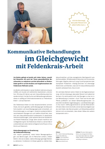 441 BEST OF BEST OF Portrait xxx Stadt ChurKommunikative Behandlungen im Gleichgewicht mit Feldenkrais-ArbeitAdresse:Bfb %u2013 Brehm Funktionale BehandlungPostfach 68, 7001 ChurTelefon: +41 79 44 549 22E-Mail: info@ursbrehm.comWeb: www.ursbrehm.comIn K%u00fcrze: Mit seiner Arbeit zeigt Urs Brehm, wie wirkungsvoll die Feldenkrais-Arbeit dabei helfen kann, Beweglichkeit, Vitalit%u00e4t und Lebensqualit%u00e4t nachhaltig zu verbessern.Urs Brehm gelingt es bereits seit vielen Jahren, sowohl bei Menschen als auch bei Tieren gesundheitliche Beschwerden zu reduzieren und die Gesundheit zu f%u00f6rdern. Dabei greift er auf die Ans%u00e4tze und Vorgehensweisen der Feldenkrais-Methode zur%u00fcck.Urs Brehm erlitt bereits in seiner Kindheit mehrere schwere Unf%u00e4lle und musste sich zahlreichen Operationen unterziehen. Mit etwa 30 Jahren war sein Gesundheitszustand besonders kritisch. Auf der Suche nach Behandlungsmethoden stiess er zuf%u00e4llig auf Informationsmaterial zur FeldenkraisArbeit %u2013 und war fasziniert. Die Feldenkrais-Arbeit ist eine k%u00f6rperorientierte Lernmethode, die durch gezielte, sanfte Bewegungen die Bewusstheit erweitert und neue Bewegungsmuster entwickelt, um Einschr%u00e4nkungen zu verringern. Zun%u00e4chst probierte Brehm verschiedenen %u00dcbungen aus und stellte schnell fest, dass sich sein Gesundheitszustand verbesserte. Er absolvierte mehrere Ausbildungen, unter anderem bei einer Assistentin von Mosh%u00e9 Feldenkrais. Einige Jahre danach machte er seine Begeisterung f%u00fcr die Feldenkrais-Arbeit zu seinem Beruf und betreibt seit vielen Jahren erfolgreich eine Praxis in Chur, Z%u00fcrich und %u00d6sterreich.Kleine Bewegungen zur Erweiterung der Selbstwahrnehmung%u00abIch mache spezifi sche, meist kleine Bewegungs%u00fcbungen und Ber%u00fchrungen, die im Menschen wirken%u00bb, erkl%u00e4rt Brehm. Ziel sei es dabei, inaktive Bewegungsm%u00f6glichkeiten zu aktivieren, Funktionen im K%u00f6rper gezielt zu st%u00e4rken bzw. abzu schw%u00e4chen und das energetische Gleichgewicht wiederherzustellen. Oft behandelt er Menschen mit chronischen St%u00f6rungen, Migr%u00e4ne, aber auch Long-Covid-Symptomen oder komplexen Problemen. %u00abH%u00e4ufi g berichten mir ehemalige Klientinnen und Klienten, dass sich ihr Gesundheitszustand deutlich verbessert hat%u00bb, freut er sich.Ein zentrales Element seiner Arbeit ist die Eigenverantwortung: %u00abIch bin %u00fcberzeugt, dass jeder Mensch sich selbst helfen kann. Es reicht jedoch nicht, die %u00dcbungen nur bei mir in der Behandlung zu machen.%u00bb Auch Tiere wie Hunde oder Pferde profi tieren von diesen Behandlungsimpulsen. Zudem f%u00fchrt Urs Brehm regelm%u00e4ssig Aus- und Weiterbildungen in Chur durch. Hoffnungsvoll blickt er auf das %u00c4lterwerden: %u00abMit dem Alter nimmt die Kraft und die Geschwindigkeit zwar ab, doch Geist, das Nervensystem und K%u00f6rperbewusstheit k%u00f6nnen sich so entwickeln, dass dieser Abbau bei weitem kompensiert wird.%u00bb%u00abIch bin %u00fcberzeugt, dass jeder Mensch sich selbst helfen kann.%u00bb