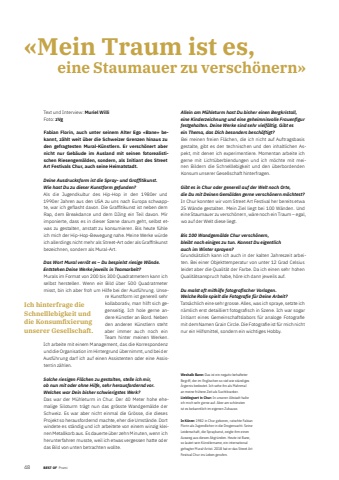 481 BEST OF BEST OF Promi%u00abMein Traum ist es, eine Staumauer zu versch%u00f6nern%u00bbText und Intervie Muriel WilliFoto: zVgFabian Florin, auch unter seinem Alter Ego %u00abBane%u00bb bekannt, z%u00e4hlt weit %u00fcber die Schweizer Grenzen hinaus zu den gefragtesten Mural-K%u00fcnstlern. Er versch%u00f6nert aber nicht nur Geb%u00e4ude im Ausland mit seinen fotorealistischen Riesengem%u00e4lden, sondern, als Initiant des Street Art Festivals Chur, auch seine Heimatstadt. Deine Ausdrucksform ist die Spray- und Graffi tikunst. Wie hast Du zu dieser Kunstform gefunden?Als die Jugendkultur des Hip-Hop in den 1980er und 1990er Jahren aus den USA zu uns nach Europa schwappte, war ich geflasht davon. Die Graffi tikunst ist neben dem Rap, dem Breakdance und dem DJing ein Teil davon. Mir imponierte, dass es in dieser Szene darum geht, selbst etwas zu gestalten, anstatt zu konsumieren. Bis heute f%u00fchle ich mich der Hip-Hop-Bewegung nahe. Meine Werke w%u00fcrde ich allerdings nicht mehr als Street-Art oder als Graffi tikunst bezeichnen, sondern als Mural-Art.Das Wort Mural verr%u00e4t es %u2013 Du bespielst riesige W%u00e4nde. Entstehen Deine Werke jeweils in Teamarbeit?Murals im Format von 200 bis 300 Quadratmetern kann ich selbst herstellen. Wenn ein Bild %u00fcber 500 Quadratmeter misst, bin ich aber froh um Hilfe bei der Ausf%u00fchrung. Unsere Kunstform ist generell sehr kollaborativ, man hilft sich gegenseitig. Ich hole gerne andere K%u00fcnstler an Bord. Neben den anderen K%u00fcnstlern steht aber immer auch noch ein Team hinter meinen Werken. Ich arbeite mit einem Management, das die Korrespondenz und die Organisation im Hintergrund %u00fcbernimmt, und bei der Ausf%u00fchrung darf ich auf einen Assistenten oder eine Assistentin z%u00e4hlen. Solche riesigen Fl%u00e4chen zu gestalten, stelle ich mir, ob nun mit oder ohne Hilfe, sehr herausfordernd vor. Welches war Dein bisher schwierigstes Werk?Das war der M%u00fchleturm in Chur. Der 40 Meter hohe ehemalige Siloturm tr%u00e4gt nun das gr%u00f6sste Wandgem%u00e4lde der Schweiz. Es war aber nicht einmal die Gr%u00f6sse, die dieses Projekt so herausfordernd machte, eher die Umst%u00e4nde. Dort windete es st%u00e4ndig und ich arbeitete von einem winzig kleinen Metallkorb aus. Es dauerte %u00fcber zehn Minuten, wenn ich herunterfahren musste, weil ich etwas vergessen hatte oder das Bild von unten betrachten wollte.Allein am M%u00fchleturm hast Du bisher einen Bergkristall, eine Kinderzeichnung und eine geheimnisvolle Frauenfi gur festgehalten. Deine Werke sind sehr vielf%u00e4ltig. Gibt es ein Thema, das Dich besonders besch%u00e4ftigt?Bei meinen freien Fl%u00e4chen, die ich nicht auf Auftragsbasis gestalte, gibt es den technischen und den inhaltlichen Aspekt, mit denen ich experimentiere. Momentan arbeite ich gerne mit Licht%u00fcberblendungen und ich m%u00f6chte mit meinen Bildern die Schnelllebigkeit und den %u00fcberbordenden Konsum unserer Gesellschaft hinterfragen. Gibt es in Chur oder generell auf der Welt noch Orte, die Du mit Deinen Gem%u00e4lden gerne versch%u00f6nern m%u00f6chtest?In Chur konnten wir vom Street Art Festival her bereits etwa 25 W%u00e4nde gestalten. Mein Ziel liegt bei 100 W%u00e4nden. Und eine Staumauer zu versch%u00f6nern, w%u00e4re noch ein Traum %u2013 egal, wo auf der Welt diese liegt. Bis 100 Wandgem%u00e4lde Chur versch%u00f6nern, bleibt noch einiges zu tun. Kannst Du eigentlich auch im Winter sprayen?Grunds%u00e4tzlich kann ich auch in der kalten Jahreszeit arbeiten. Bei einer Objekttemperatur von unter 12 Grad Celsius leidet aber die Qualit%u00e4t der Farbe. Da ich einen sehr hohen Qualit%u00e4tsanspruch habe, h%u00f6re ich dann jeweils auf. Du malst oft mithilfe fotografi scher Vorlagen. Welche Rolle spielt die Fotografi e f%u00fcr Deine Arbeit?Tats%u00e4chlich eine sehr grosse. Alles, was ich spraye, setzte ich n%u00e4mlich erst detailliert fotografi sch in Szene. Ich war sogar Initiant eines Gemeinschaftslabors f%u00fcr analoge Fotografi e mit dem Namen Grain Circle. Die Fotografi e ist f%u00fcr mich nicht nur ein Hilfsmittel, sondern ein wichtiges Hobby. Weshalb Bane: Das ist ein negativ behafteter Begriff, der im Englischen so viel wie st%u00e4ndiges %u00c4rgernis bedeutet. Ich sehe ihn als Mahnmal an meine fr%u00fchere Zeit als Suchtkranker. Lieblingsort in Chur: In unserer Altstadt halte ich mich sehr gerne auf. Aber am sch%u00f6nsten ist es bekanntlich im eigenen Zuhause.In K%u00fcrze: 1982 in Chur geboren, rutschte Fabian Florin als Jugendlicher in die Drogensucht. Seine Leidenschaft, die Spraykunst, zeigte ihm einen Ausweg aus diesen Abgr%u00fcnden. Heute ist Bane, so lautet sein K%u00fcnstlername, ein international gefragter Mural-Artist. 2018 hat er das Street Art Festival Chur ins Leben gerufen. Ich hinterfrage die Schnelllebigkeit und die Konsumfi xierung unserer Gesellschaft.
