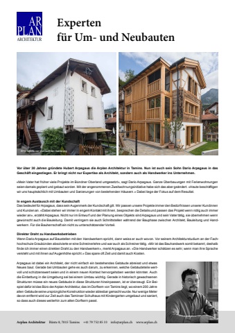 52 BEST OF xxxARPLANARCHITEKTURExperten f%u00fcr Um- und NeubautenVor %u00fcber 30 Jahren gr%u00fcndete Hubert Arpagaus die Arplan Architektur in Tamins. Nun ist auch sein Sohn Dario Arpagaus in das Gesch%u00e4ft eingestiegen. Er bringt nicht nur Expertise als Architekt, sondern auch als Handwerker ins Unternehmen.%u00abMein Vater hat fr%u00fcher viele Projekte im B%u00fcndner Oberland umgesetzt%u00bb, sagt Dario Arpagaus. Ganze %u00dcberbauungen mit Ferienwohnungen seien damals geplant und gebaut worden. Mit der angenommenen Zweitwohnungsinitiative habe sich das aber ge%u00e4ndert. %u00abHeute besch%u00e4ftigen wir uns haupts%u00e4chlich mit Umbauten und Sanierungen von bestehenden H%u00e4usern.%u00bb Dabei liege der Fokus auf dem Resultat.In engem Austausch mit der KundschaftDas bedeutet f%u00fcr Arpagaus, dass sein Augenmerk der Kundschaft gilt. Wir passen unsere Projekte immer den Bed%u00fcrfnissen unserer Kundinnen und Kunden an. %u00abDabei stehen wir immer in engem Kontakt mit ihnen, besprechen die Details und passen das Projekt wenn n%u00f6tig auch immer wieder an%u00bb, erz%u00e4hlt Arpagaus. Nicht nur im Entwurf und der Planung eines Objekts sind Arpagaus und sein Vater t%u00e4tig, sie %u00fcbernehmen wenn gew%u00fcnscht auch die Bauleitung. Damit verringern sie auch Schnittstellen w%u00e4hrend der Bauphase zwischen Architekt, Bauleitung und Handwerkern. F%u00fcr die Bauherrschaft ein nicht zu untersch%u00e4tzender Vorteil.Direkter Draht zu Handwerksbetrieben Wenn Dario Arpagaus auf Baustellen mit den Handwerkern spricht, dann weiss er auch wovon. Vor seinem Architekturstudium an der Fachhochschule Graub%u00fcnden absolvierte er eine Schreinerlehre und war auch als Schreiner t%u00e4tig. %u00abMir ist das Bauhandwerk somit bekannt, deshalb fi nde ich immer einen direkten Draht zu den Handwerkern%u00bb, merkt Arpagaus an. %u00abDie Handwerker sch%u00e4tzen es sehr, wenn man ihre Sprache versteht und mit ihnen auf Augenh%u00f6he spricht.%u00bb Das spare oft Zeit und damit auch Kosten. Arpagaus ist dabei ein Architekt, der nicht einfach ein bestehendes Geb%u00e4ude abreisst und etwas Neues baut. Gerade bei Umbauten gehe es auch darum, zu erkennen, welche Geb%u00e4udeteile wertvoll und sch%u00fctzenswert seien und in einem neuen Kontext hervorgehoben werden k%u00f6nnten. Auch die Einbettung in die Umgebung sei bei einem Umbau wichtig. Gerade in historisch gewachsenen Strukturen m%u00fcsse ein neues Geb%u00e4ude in diese Strukturen hineinpassen, ist er %u00fcberzeugt. Ein Beispiel daf%u00fcr ist das B%u00fcro der Arplan Architektur, das im Dorfkern von Tamins liegt, wo einem 200 Jahre alten Geb%u00e4ude seine urspr%u00fcngliche Konstruktion wieder ablesbar gemacht wurde. Nur wenige Meter davon entfernt wird zur Zeit auch das Taminser Schulhaus mit Kindergarten umgebaut und saniert, so dass auch dieses weiterhin zum alten Dorfkern passt.Arplan Architektur B%u00fcnte 8, 7015 Tamins +41 79 752 85 33 info@arplan.ch www.arplan.chEFH Tamins vor und nach der Sanierung