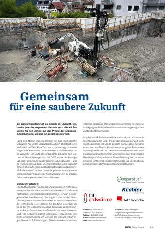BEST OF BEST OF Churer Rheintal Portrait xxx 551 Gemeinsam f%u00fcr eine saubere ZukunftAdresse: MR%u00a0Erdw%u00e4rme AGCaplutta 1, 7403 Rh%u00e4z%u00fcnsTelefon: +41 81 630 04 04E-Mail: info@mr-erdwaerme.chWeb: www.mr-erdwaerme.chIn K%u00fcrze: Mit ihren nachhaltigen Energiesch%u00f6pfungsmethoden setzt sich die MR Erdw%u00e4rme AG aktiv f%u00fcr eine Zukunft mit weniger CO2-Belastung ein.Die Erdw%u00e4rmenutzung ist die Energie der Zukunft, bzw. bereits jene der Gegenwart. Deshalb setzt die MR%u00a0 Erdw%u00e4rme AG seit Jahren auf das Prinzip der Erdw%u00e4rmesondenbohrung. Und das mit anhaltendem Erfolg.Rund eine Million Erdsondenmeter hat das Team der MR Erdw%u00e4rme AG in den vergangenen Jahren abgeteuft. Eine eindr%u00fcckliche Zahl. Eine Zahl auch, die aufzeigt, dass der Slogan des Rh%u00e4z%u00fcnser Unternehmens %u2013 %u00abGemeinsam f%u00fcr die Zukunft%u00bb %u2013 im Laufe der vergangenen 18 Jahre kein bisschen an Aktualit%u00e4t eingeb%u00fcsst hat. 2007 wurde die damalige Luzi Bohr-Drilling AG durch Valentin Luzi gegr%u00fcndet %u2013 und die Nutzung erneuerbarer Energien ist mittlerweile wichtiger denn je. Die auf Erdw%u00e4rmesondenbohrungen spezialisierte MR Erdw%u00e4rme AG bedient dabei die gesamte Kundenpalette vom Einfamilienhaus eines Privatkunden bis hin zu grossen Geb%u00e4udekomplexen oder Industriebauten.St%u00e4ndiger Fortschritt%u00abDie Nutzung der Erdw%u00e4rme als Energiequelle ist nicht bloss eine zukunftsorientierte, sondern auch eine durch und durch nachhaltige Energiesch%u00f6pfungsmethode%u00bb, erkl%u00e4rt Firmengr%u00fcnder Michael Reimann. Wichtig ist dabei f%u00fcr den Unternehmer, dass er und sein Team stets auf dem neusten Stand der Technik sind. Eine Technik, die st%u00e4ndig in Bewegung ist. So ist die MR Erdw%u00e4rme AG etwa exklusiver Vertriebspartner im Raum Graub%u00fcnden und Tessin f%u00fcr das neue Schweizer Split-Pipe-Erdw%u00e4rmesystem %u00abseparatus%u00bb. Hinzu kommt eine breite Angebotspalette im Bereich der Erdsondenbohrungen, Bentonit-Sp%u00fclbohrungen, Filterbrunneninstallationen, Thermal-Response Messungen/Auswertungen bis hin zur Auslegung von Erdsondenfeldern und anderen geologischen Zustandsuntersuchungen.Was bei der MR Erdw%u00e4rme AG derweil auch trotz all den technischen Neuheiten und Fortschritten im Laufe der Zeit stets gleich geblieben ist, ist die gelebte Kundenn%u00e4he. So kann etwa, wer am Thema Erdw%u00e4rmenutzung und Erdsondenbohrung interessiert ist, beim innovativen Rh%u00e4z%u00fcnser Energiegewinnungsunternehmen vom Vorteil einer kostenlosen Beratung vor Ort profi tieren. Einer Beratung, bei der unter anderem umfassende Kostenrechnungen und Vergleiche zu anderen Heizsystemen zusammengestellt werden.
