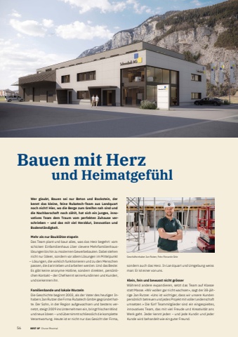 561 BEST OF Portrait xxxBauen mit Herz und Heimatgef%u00fchlWer glaubt, Bauen sei nur Beton und Backstein, der kennt das kleine, feine Rubatech-Team aus Landquart noch nicht! Hier, wo die Berge zum Greifen nah sind und die Nachbarschaft noch z%u00e4hlt, hat sich ein junges, innovatives Team dem Traum vom perfekten Zuhause verschrieben %u2013 und das mit viel Herzblut, Innovation und Bodenst%u00e4ndigkeit.Mehr als nur Baukl%u00f6tze stapelnDas Team plant und baut alles, was das Herz begehrt: vom schicken Einfamilienhaus %u00fcber clevere Mehrfamilienhausl%u00f6sungen bis hin zu modernen Gewerbebauten. Dabei stehen nicht nur Ideen, sondern vor allem L%u00f6sungen im Mittelpunkt %u2013 L%u00f6sungen, die wirklich funktionieren und zu den Menschen passen, die darin leben und arbeiten werden. Und das Beste: Es gibt keine anonyme Hotline, sondern direkten, pers%u00f6nlichen Kontakt %u2013 der Chef kennt seine Kundinnen und Kunden, und sie kennen ihn.Familienbande und lokale WurzelnDie Geschichte beginnt 2003, als der Vater des heutigen Inhabers Jan Rutzer die Firma Rubatech GmbH gegr%u00fcndet hatte. Der Sohn, in der Region aufgewachsen und bestens vernetzt, steigt 2009 ins Unternehmen ein, bringt frischen Wind und neue Ideen %u2013 und %u00fcbernimmt schliesslich die komplette Verantwortung. Heute ist er nicht nur das Gesicht der Firma, sondern auch das Herz. In Landquart und Umgebung weiss man: Er ist einer von uns.Klein, fein und bewusst nicht gr%u00f6sserW%u00e4hrend andere expandieren, setzt das Team auf Klasse statt Masse. %u00abWir wollen gar nicht wachsen%u00bb, sagt der 38-j%u00e4hrige Jan Rutzer. %u00abUns ist wichtiger, dass wir unsere Kunden pers%u00f6nlich betreuen und jedes Projekt mit voller Leidenschaft umsetzen.%u00bb Die f%u00fcnf Teammitglieder sind ein eingespieltes, innovatives Team, das mit viel Freude und Kreativit%u00e4t ans Werk geht. Jeder kennt jeden %u2013 und jede Kundin und jeder Kunde wird behandelt wie ein guter Freund.Gesch%u00e4ftsinhaber Jan Rutzer, Foto: Riccardo G%u00f6tzBEST OF Churer Rheintal