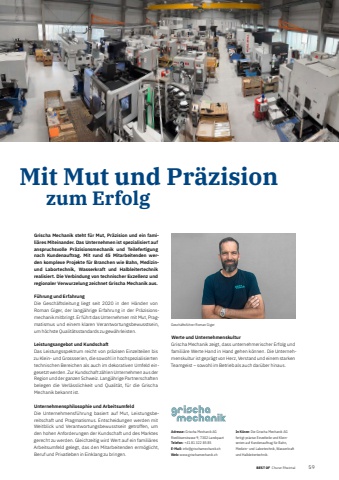 BEST OF Churer Rheintal 59BEST OF Portrait xxx 1Grischa Mechanik steht f%u00fcr Mut, Pr%u00e4zision und ein famili%u00e4res Miteinander. Das Unternehmen ist spezialisiert auf anspruchsvolle Pr%u00e4zisionsmechanik und Teilefertigung nach Kundenauftrag. Mit rund 45 Mitarbeitenden werden komplexe Projekte f%u00fcr Branchen wie Bahn, Medizinund Labortechnik, Wasserkraft und Halbleitertechnik realisiert. Die Verbindung von technischer Exzellenz und regionaler Verwurzelung zeichnet Grischa Mechanik aus.F%u00fchrung und ErfahrungDie Gesch%u00e4ftsleitung liegt seit 2020 in den H%u00e4nden von Roman Giger, der langj%u00e4hrige Erfahrung in der Pr%u00e4zisionsmechanik mitbringt. Er f%u00fchrt das Unternehmen mit Mut, Pragmatismus und einem klaren Verantwortungsbewusstsein, um h%u00f6chste Qualit%u00e4tsstandards zu gew%u00e4hrleisten.Leistungsangebot und KundschaftDas Leistungsspektrum reicht von pr%u00e4zisen Einzelteilen bis zu Klein- und Grossserien, die sowohl in hochspezialisierten technischen Bereichen als auch im dekorativen Umfeld eingesetzt werden. Zur Kundschaft z%u00e4hlen Unternehmen aus der Region und der ganzen Schweiz. Langj%u00e4hrige Partnerschaften belegen die Verl%u00e4sslichkeit und Qualit%u00e4t, f%u00fcr die Grischa Mechanik bekannt ist.Unternehmensphilosophie und ArbeitsumfeldDie Unternehmensf%u00fchrung basiert auf Mut, Leistungsbereitschaft und Pragmatismus. Entscheidungen werden mit Weitblick und Verantwortungsbewusstsein getroffen, um den hohen Anforderungen der Kundschaft und des Marktes gerecht zu werden. Gleichzeitig wird Wert auf ein famili%u00e4res Arbeitsumfeld gelegt, das den Mitarbeitenden erm%u00f6glicht, Beruf und Privatleben in Einklang zu bringen.Mit Mut und Pr%u00e4zision zum ErfolgWerte und UnternehmenskulturGrischa Mechanik zeigt, dass unternehmerischer Erfolg und famili%u00e4re Werte Hand in Hand gehen k%u00f6nnen. Die Unternehmenskultur ist gepr%u00e4gt von Herz, Verstand und einem starken Teamgeist %u2013 sowohl im Betrieb als auch dar%u00fcber hinaus.Adresse: Grischa Mechanik AGRiedl%u00f6serstrasse 9, 7302 LandquartTelefon: +41 81 322 85 85E-Mail: info@grischamechanik.chWeb: www.grischamechanik.chIn K%u00fcrze: Die Grischa Mechanik AG fertigt pr%u00e4zise Einzelteile und Kleinserien auf Kundenauftrag f%u00fcr Bahn, Medizin- und Labortechnik, Wasserkraft und Halbleitertechnik.Gesch%u00e4ftsf%u00fchrer Roman Giger