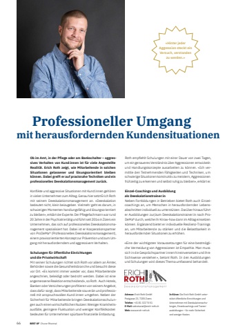 661 BEST OF BEST OF Churer Rheintal Churer Rheintal Professioneller Umgang mit herausfordernden KundensituationenAdresse: Erich Roth GmbHPostgasse 23, 7205 ZizersTelefon: +41 81 322 74 51E-Mail: sekretariat@erich-roth.chWeb: www.erich-roth.chIn K%u00fcrze: Die Erich Roth GmbH unterst%u00fctzt %u00f6ffentliche Einrichtungen und Unternehmen mit Deeskalationsschulungen, Einzelcoachings und Trainerausbildungen %u2013 f%u00fcr mehr Sicherheit und weniger Kosten. Ob im Amt, in der Pflege oder am Bankschalter %u2013 aggressives Verhalten von Kund:innen ist f%u00fcr viele Angestellte Realit%u00e4t. Erich Roth zeigt, wie Mitarbeitende in solchen Situationen gelassener und l%u00f6sungsorientiert bleiben k%u00f6nnen. Dabei greift er auf praxisnahe Techniken und ein professionelles Deeskalationsmanagement zur%u00fcck.Konflikte und aggressive Situationen mit Kund:innen geh%u00f6ren in vielen Unternehmen zum Alltag. Genau hier setzt Erich Roth mit seinem Deeskalationsmanagement an. %u00abDeeskalation bedeutet nicht, klein beizugeben. Vielmehr geht es darum, in schwierigen Momenten handlungsf%u00e4hig und l%u00f6sungsorientiert zu bleiben%u00bb, erkl%u00e4rt der Experte. Der Pflegefachmann war rund 20 Jahre in der Psychiatrie t%u00e4tig und f%u00fchrt seit 2016 in Zizers ein Unternehmen, das sich auf professionelles Deeskalationsmanagement spezialisiert hat. Dabei ist er Kooperationspartner von ProDeMa%u00ae (Professionelles Deeskalationsmanagement), einem praxisorientierten Konzept zur Pr%u00e4vention und zum Umgang mit herausforderndem und aggressivem Verhalten.Schulungen f%u00fcr %u00f6ffentliche Einrichtungen und die Privatwirtschaft Mit seinen Schulungen richtet sich Roth vor allem an %u00c4mter, Beh%u00f6rden sowie die Gesundheitsbranche und besucht diese vor Ort. %u00abEs kommt immer wieder vor, dass Mitarbeitende angeschrien, beleidigt oder bedroht werden. Dabei ist eine angemessene Reaktion entscheidend%u00bb, so Roth. Auch Hotels, Banken oder Versicherungen profi tieren von seinem Angebot, dass daf%u00fcr sorgt, dass Mitarbeitende souver%u00e4n und professionell mit anspruchsvollen Kund:innen umgehen. Neben der Sicherheit f%u00fcr Mitarbeitende bringen Deeskalationsschulungen auch einen wirtschaftlichen Nutzen: Weniger Krankheitsausf%u00e4lle, geringere Fluktuation und weniger Konfliktkosten bedeuten f%u00fcr Unternehmen sp%u00fcrbare fi nanzielle Entlastung.Roth empfi ehlt Schulungen mit einer Dauer von zwei Tagen, um ein genaueres Verst%u00e4ndnis %u00fcber Aggressionen entwickeln und Handlungskonzepte ausarbeiten zu k%u00f6nnen. %u00abIch vermittle den Teilnehmenden F%u00e4higkeiten und Techniken, um schwierige Situationen konstruktiv zu meistern, Aggressionen fr%u00fchzeitig zu erkennen und selbst ruhig zu bleiben%u00bb, erkl%u00e4rt er.Einzel-Coachings und Ausbildung als Deeskalationstrainer:inNeben Fortbildungen in Betrieben bietet Roth auch Einzelcoachings an, um Menschen in herausfordernden Lebensabschnitten individuell zu unterst%u00fctzen. Dar%u00fcber hinaus f%u00fchrt er Ausbildungen zur/zum Deeskalationstrainer:in nach ProDeMa%u00ae durch, welche ihr Know-how dann im Alltag einsetzen k%u00f6nnen. Erg%u00e4nzend bietet er individuelle Resilienz-Trainings an, um Mitarbeitende zu st%u00e4rken und die Belastbarkeit in herausfordernden Situationen zu erh%u00f6hen.%u00abEine der wichtigsten Voraussetzungen f%u00fcr eine bestm%u00f6gliche Vermeidung von Aggressionen ist Empathie. Man muss sich in die Gespr%u00e4chspartner:innen hineinversetzen und ihre Sichtweise verstehen%u00bb, betont Roth. In den Ausbildungen und Schulungen wird dieses Thema umfassend behandelt.%u00abHinter jeder Aggression steckt ein Versuch, verstanden zu werden.%u00bb