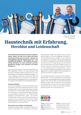 BEST OF Churer Rheintal 67BEST OF Portrait xxx 1Haustechnik mit Erfahrung, Herzblut und Leidenschaft Adresse: Savoldelli Haustechnik AGBungertweg 15, 7206 IgisTelefon: +41 81 322 63 30E-Mail: info@savoldelli-ht.chFacebook: Savoldelli Haustechnik AGIn K%u00fcrze: Die Savoldelli Haustechnik AG ist spezialisiert auf Sanit%u00e4r-, Heizungsund L%u00fcftungssysteme aller Art. Theo Savoldelli und sein Team denken mit und fi nden die individuell beste L%u00f6sung.Die Savoldelli Haustechnik AG ist ein kleiner Handwerksbetrieb, welcher seit mehr als 10 Jahren den Endverbrauchenden bei allen Arten von Sanit%u00e4r-, Heizungs- und L%u00fcftungsarbeiten optimale L%u00f6sungen bieten kann %u2013 auch ausserhalb des Standards %u2026 Wir verstehen uns als pers%u00f6nliche Dienstleister f%u00fcr unsere Kundschaft und bieten gesamthafte L%u00f6sungen, auch zusammen mit Partnerbetrieben, an. Egal ob Sie ihr Bad umbauen und zur pers%u00f6nlichen Wellnessoase umgestalten m%u00f6chten, eine neue, alternative Heizl%u00f6sung f%u00fcr Ihr Geb%u00e4ude installieren wollen oder auch nur eine kleine Reparatur eines defekten Anlageteils ben%u00f6tigen %u2013 mit unserer langj%u00e4hrigen Erfahrung, der pers%u00f6nlichen Beratung und grossem Ideenreichtum unterst%u00fctzen wir Sie gerne. Sobald es speziell und aussergew%u00f6hnlich ist, wird die Motivation f%u00fcr eine gute, kundenspezifi sche L%u00f6sung besonders gross %u2026Ein grosses NetzwerkDank unseres langj%u00e4hrigen und partnerschaftlichen Zusammenarbeitens mit diversen Handwerkern k%u00f6nnen wir Ihnen das Bauvorhaben auch als Gesamtdienstleister anbieten, so dass Sie sich um nichts sorgen m%u00fcssen. Wir beraten Sie bei der Planung und Auswahl aller ben%u00f6tigten Materialien und Komponenten, verhandeln mit den am Bauvorhaben beteiligten Handwerksbetrieben, planen und koordinieren alle Arbeiten. Vertrauen Sie auf unsere Erfahrung und Kompetenz f%u00fcr eine reibungslose Umsetzung Ihrer Projekte. Selbstverst%u00e4ndlich k%u00f6nnen wir auch mit Ihren gewohnten %u00abHaushandwerkern%u00bb zusammenarbeiten.Mit viel Know-how, Herzblut und Leidenschaft Als gelernter Sanit%u00e4rinstallateur und Haustechnikplaner mit einem Technikerdiplom HF in Koordination und diversen Weiterbildungen verf%u00fcgt Theo Savoldelli %u00fcber das notwendige R%u00fcstzeug, um mit seiner langj%u00e4hrigen Erfahrung und viel Leidenschaft optimale L%u00f6sungen f%u00fcr die Kundschaft auszuarbeiten und umzusetzen. %u00abDie pers%u00f6nliche Beratung ist uns eben so wichtig wie die fachm%u00e4nnische Umsetzung. Wir konnten seit der Firmengr%u00fcndung im Jahr 2011 bereits sehr viele, spannende und innovative Projekte umsetzen und freuen uns, dies auch in Zukunft tun zu k%u00f6nnen. Aktuell sind wir in den Vorbereitungen f%u00fcr ein Dreifamilienhaus, welches %u00abnur%u00bb mit einer thermischen Solaranlage und entsprechend abgestimmter Architektur beheizt wird. Solche Projekte sind spannend und fordern uns t%u00e4glich aufs Neue %u2026%u00bbAuch komplette Planungen von haustechnischen Anlagen im Bereich Sanit%u00e4r %u2013 Heizung %u2013 L%u00fcftung k%u00f6nnen wir Ihnen anbieten. Hier sind unsere Kapazit%u00e4ten jedoch auf kleinere Objekte begrenzt. Aber auch hier haben wir spezialisierte Planungsbetriebe an unserer Seite, mit welchen wir freundschaftlich zusammenarbeiten und welche wir sehr gerne empfehlen oder beiziehen k%u00f6nnen. Immer mit dem Fokus: pers%u00f6nlich, flexibel, kompetent und mit viel Freude am Tun %u2026Firmengr%u00fcnder Ottilio Savoldelli mit Inhaber und Gesch%u00e4ftsf%u00fchrer Theo Savoldelli (v. l.)