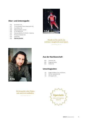 BEST OF Inhaltsverzeichnis 5Ober- und Unterengadin116 kunstraum riss117 TH Architekten Tuena Hauenstein AG118 Auto Mathis AG120 MDS Architektur GmbH 120 M. De Stefani AG122 Olympia Bob Run St.Moritz %u2013 Celerina123 Pensa Architekten AG124 Hotel Post126 Fabrizio DanieleSpecialsInfos und AngeboteSeite 78Aus der Nachbarschaft128 Interkran AG130 Flagman Group134 Miplan AGUmschlagseitenU2 Engel & V%u00f6lkers Chur und DavosU3 Schuler Auktionen AGU4 Immoguide AGIch brauche eine Figur, um mich zu entfalten.Fabrizio Daniele, Seite 126Musik ist f%u00fcr mich ein sch%u00f6ner Ausgleich zum Sport.Niklas Hartweg, Seite 114126114