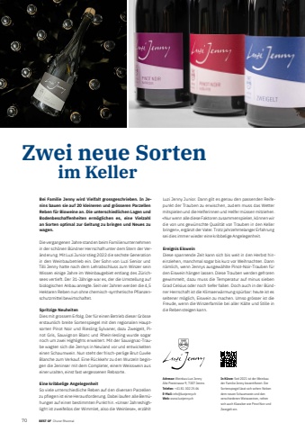 701 BEST OF BEST OF Portrait xxx Churer RheintalZwei neue Sorten im KellerAdresse: Weinbau Luzi JennyAlte Poststrasse 9, 7307 JeninsTelefon: +41 81 302 25 46E-Mail: info@luzijenny.chWeb: www.luzijenny.chIn K%u00fcrze: Seit 2021 ist der Weinbau der Familie Jenny biozertifi ziert. Der Sortenspiegel l%u00e4sst sich sehen: Neben dem neuen Schaumwein und den verschiedenen Weissweinen, reihen sich auch Klassiker wie Pinot Noir und Zweigelt ein.Bei Familie Jenny wird Vielfalt grossgeschrieben. In Jenins bauen sie auf 20 kleineren und gr%u00f6sseren Parzellen Reben f%u00fcr Bioweine an. Die unterschiedlichen Lagen und Bodenbeschaffenheiten erm%u00f6glichen es, eine Vielzahl an Sorten optimal zur Geltung zu bringen und Neues zu wagen.Die vergangenen Jahre standen beim Familienunternehmen in der sch%u00f6nen B%u00fcndner Herrschaft unter dem Stern der Ver%u00e4nderung. Mit Luzi Junior stieg 2022 die sechste Generation in den Weinbaubetrieb ein. Der Sohn von Luzi Senior und Tilli Jenny hatte nach dem Lehrabschluss zum Winzer sein Wissen einige Jahre im Weinbaugebiet entlang des Z%u00fcrichsees vertieft. Der 31-J%u00e4hrige war es, der die Umstellung auf biologischen Anbau anregte. Seit vier Jahren werden die 4,5 Hektaren Reben nun ohne chemisch-synthetische Pflanzenschutzmittel bewirtschaftet. Spritzige NeuheitenDies mit grossem Erfolg. Der f%u00fcr einen Betrieb dieser Gr%u00f6sse erstaunlich breite Sortenspiegel mit den regionalen Hauptsorten Pinot Noir und Riesling Sylvaner, dazu Zweigelt, Pinot Gris, Sauvignon Blanc und Rheinriesling wurde sogar noch um zwei Highlights erweitert. Mit der Sauvignac-Traube wagten sich die Jennys in Neuland vor und entwickelten einen Schaumwein. Nun steht der frisch-perlige Brut Cuv%u00e9e Blanche zum Verkauf. Eine R%u00fcckkehr zu den Wurzeln begingen die Jeninser mit dem Completer, einem Weisswein aus einer uralten, einst fast vergessenen Rebsorte. Eine kribbelige AngelegenheitSo viele unterschiedliche Reben auf den diversen Parzellen zu pflegen ist eine Herausforderung. Dabei laufen alle Bem%u00fchungen auf einen bestimmten Punkt hin. %u00abUnser Jahreshighlight ist zweifellos der Wimmlet, also die Weinlese%u00bb, erz%u00e4hlt Luzi Jenny Junior. Dann gilt es genau den passenden Reifepunkt der Trauben zu erwischen, zudem muss das Wetter mitspielen und die Helferinnen und Helfer m%u00fcssen mitziehen. %u00abNur wenn alle diese Faktoren zusammenspielen, k%u00f6nnen wir die von uns gew%u00fcnschte Qualit%u00e4t von Trauben in den Keller bringen%u00bb, erg%u00e4nzt der Vater. Trotz jahrzehntelanger Erfahrung sei dies immer wieder eine kribbelige Angelegenheit. Ereignis EisweinDiese spannende Zeit kann sich bis weit in den Herbst hineinziehen, manchmal sogar bis kurz vor Weihnachten. Dann n%u00e4mlich, wenn Jennys ausgew%u00e4hlte Pinot-Noir-Trauben f%u00fcr den Eiswein h%u00e4ngen lassen. Diese Trauben werden gefroren gewimmelt, dazu muss die Temperatur auf minus sieben Grad Celsius oder noch tiefer fallen. Doch auch in der B%u00fcndner Herrschaft ist die Klimaerw%u00e4rmung sp%u00fcrbar: heute ist es seltener m%u00f6glich, Eiswein zu machen. Umso gr%u00f6sser ist die Freude, wenn die Winzerfamilie bei aller K%u00e4lte und Stille in die Reben steigen kann.
