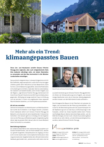 BEST OF BEST OF Churer Rheintal Portrait xxx 71 Mehr als ein Trend: klimaangepasstes BauenAdresse: maruggarchitektur gmbhDunkle B%u00f6ngert 19, 7306 Fl%u00e4schTelefon: +41 81 302 41 53E-Mail: info@maruggarchitektur.chWeb: www.maruggarchitektur.chIn K%u00fcrze: Die maruggarchitektur gmbh entwirft und plant qualitativ anspruchsvolle Um- und Neubauten mit viel Liebe zum Detail %u2013 vom Entwurf bis zur Ausf%u00fchrung.Ihren Um- und Neubauten verleiht Simona FritscheMarugg eine regionale, aber auch zeitgen%u00f6ssische Note. Dies bedeutet allerdings mehr, als lokale Materialien zu verwenden und den Bau harmonisch in die B%u00fcndner Landschaften einzuf%u00fcgen. Das puristisch-elegante Haus, in dessen Erdgeschoss sich ihr B%u00fcro befi ndet, zeigt exemplarisch, wof%u00fcr die Firma maruggarchitektur gmbh steht: Reduktion auf das Wesentliche, klare Formen und mit Bedacht ausgew%u00e4hlte, nat%u00fcrliche Materialien. %u00abIch arbeite gerne mit Stein, habe aber ebenso viele Holzbauten realisiert und beziehe beides, wenn immer m%u00f6glich, aus der Region%u00bb, sagt Simona Fritsche-Marugg. Gemeinsam mit ihrem Mann Marcel Fritsche hat sie 2019 das Architekturb%u00fcro gegr%u00fcndet. 2022 ging der lange ersehnte Traum in Erf%u00fcllung, und sie konnten in ihrem neu angebauten Haus separate R%u00e4umlichkeiten beziehen, um ihre Projekte auszuarbeiten. Alt mit neu verwebenZahlreiche Umbauten von Wohnh%u00e4usern und Weinbaubetrieben durfte die Architektin in der Region bereits umsetzen. Einem Geb%u00e4ude n%u00e4hert sich Simona Fritsche-Marugg mit Bedacht und erkundet all seine bestehenden historischen Schichten. Erst danach geht es im Dialog mit den Eigent%u00fcmern an die Planung und Realisierung der Umgestaltung. Bei dieser legt sie grossen Wert darauf, alte mit neuen Bestandteilen harmonisch zu verweben.Beschattung mitplanenEin weiteres Detail f%u00e4llt an den realisierten Bauprojekten auf: Grosse Fensterfronten, wie sie heute beliebt sind, werden nur gezielt eingesetzt, beispielsweise als Zugang und Aussicht in einen Garten oder in eine idyllische Hofsituation. Dies mag einerseits den Gegebenheiten der oftmals historischen Geb%u00e4ude geschuldet sein, andererseits steht aber eine bewusste Entscheidung von Simona Fritsche-Marugg dahinter: %u00abIn Zeiten der Klimaerw%u00e4rmung ist es fraglich, wie sinnvoll riesige Glasfronten sind, die im Sommer st%u00e4ndig abgedeckt werden m%u00fcssen und den Wohnbereich stark aufheizen.%u00bbDas klimagerechte Bauen ist der Fl%u00e4scherin ein grosses Anliegen, das sie bereits bei der Planung miteinbezieht. %u00abIch nutze f%u00fcr die Beschattung bewusst das Zusammenspiel mit der Bepflanzung rund um das Haus und R%u00fcckspr%u00fcnge in der Fassade%u00bb, erkl%u00e4rt sie. Diese Aspekte sollten beim Thema nachhaltiges Bauen ebenso ber%u00fccksichtigt werden, wie die Wahl der Energie, die man nutzt. %u00abHeute muss anders gebaut werden als vor zehn Jahren, um dem Klimawandel gerecht zu werden%u00bb, betont Simona Fritsche-Marugg. Marcel Fritsche und Simona Fritsche-Marugg