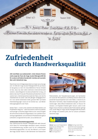 BEST OF Davos %u2013 Klosters %u2013 Pr%u00e4ttigau BEST OF Portrait xxx 771Zufriedenheit durch Handwerksqualit%u00e4tAdresse: Hugo Jacobs Malergesch%u00e4ft AG Parkstrasse 10, 7270 Davos PlatzTelefon: +41 81 413 55 45E-Mail: maler@hugojacobs.chWeb: www.hugojacobs.chIn K%u00fcrze: Die Hugo Jacobs Malergesch%u00e4ft AG ist der Ansprechpartner, wenn es um professionelle Malerarbeiten aller Art im Raum Davos Klosters geht.%u00abWir sind Maler aus Leidenschaft.%u00bb Unter diesem Firmenmotto sorgt das Team der Hugo Jacobs Malergesch%u00e4ft AG f%u00fcr rundum zufriedene Kundschaft. Und das seit nunmehr %u00fcber acht Jahrzehnte lang.Manchmal ist ein Erfolgsrezept ebenso simpel wie wirkungsvoll. Im Falle der Hugo Jacobs Malergesch%u00e4ft AG aus Davos ist das genau so. Denn f%u00fcr Gesch%u00e4ftsf%u00fchrer Florian Amb%u00fchl ist klar, dass das %u00fcber allem stehende Unternehmensziel namens vollumf%u00e4ngliche Kundenzufriedenheit einzig und alleine %u00fcber das Prinzip der Mitarbeiterzufriedenheit erreicht werden kann. Dementsprechend setzt der Mann, der den Familienbetrieb mit seiner %u00fcber 80-j%u00e4hrigen Erfolgsgeschichte in der vierten Generation leitet, grossen Wert auf beste Arbeitsbedingungen sowie auf ein breites Aus- und Weiterbildungsangebot f%u00fcr sein Team. Dieses Team %u2013 in dem unter anderem drei Malermeister und Projektleiter t%u00e4tig sind %u2013 zahlt dies seinem Chef mit qualitativ hochwertiger und fachkundiger Arbeit zur%u00fcck. Und somit geht die erfrischend einfache Erfolgsrezeptur von qualitativ hochwertig ausgebildeten und zufriedenen Mitarbeitenden gleich zufriedene und gl%u00fcckliche Kunden, so wunderbar auf.Umfassendes DienstleistungsportfolioDas traditionsreiche Davoser Malergesch%u00e4ft steht derweil nicht bloss f%u00fcr hochwertiges Handwerk sowie individuelle Kundenbetreuung, sondern auch f%u00fcr ein umfassendes Dienstleistungsportfolio. So sind die M%u00e4nner und Frauen des Hugo Jacobs Teams in den Bereichen der klassischen Malerarbeiten, der Fassadensanierungen, der Spritzarbeiten sowie der Renovationen und Restaurationen ebenso der passende Ansprechpartner wie in den F%u00e4llen, in denen es um dekorative Techniken, Naturholzbehandlungen, Schimmelsanierungen, Naturofloorinstalationen oder um Stucco-Veneziano- und Tapezier-Arbeiten geht. Kurzum, wenn in der Region Davos Klosters professionelle Malerarbeiten gefragt sind, ist der Weg zur Hugo Jacobs Malergesch%u00e4ft AG erstens der richtige und zweitens jener, der f%u00fcr rundum zufriedene Gesichter sorgt.